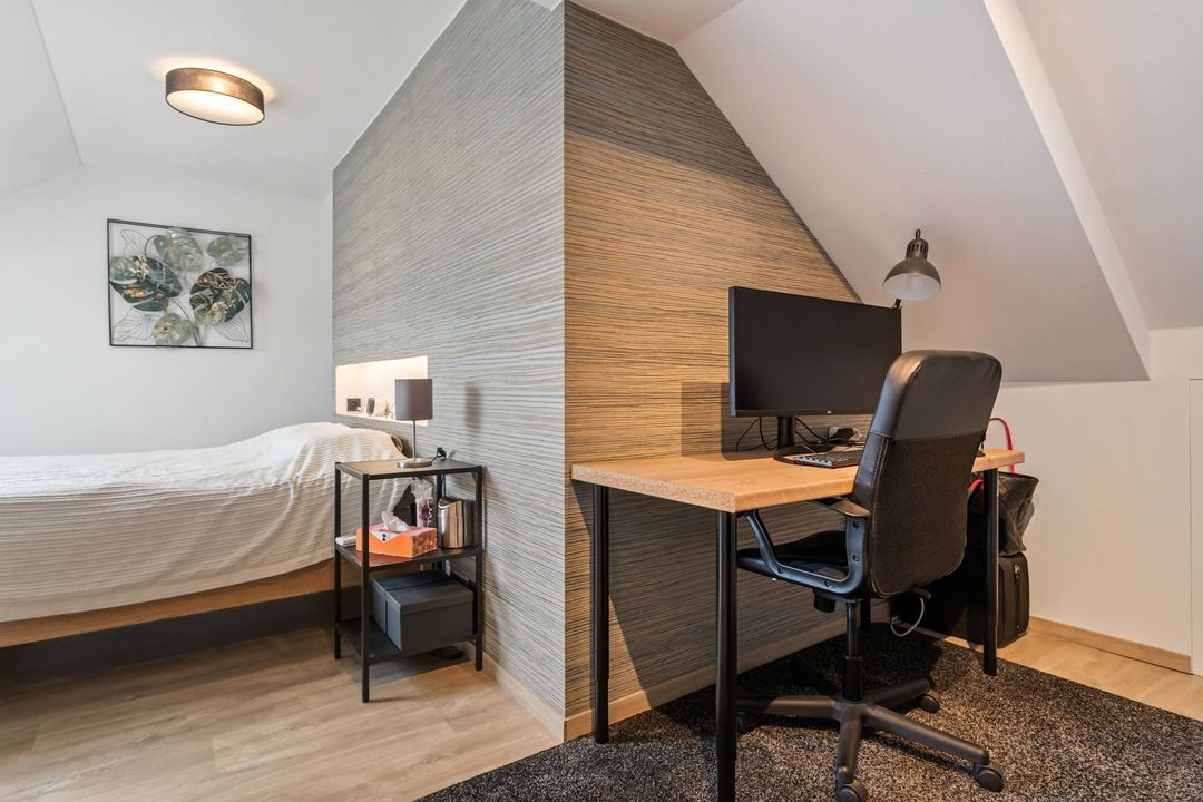 Op de tweede verdieping bevindt zich de master bedroom met op maat gemaakte kasten, ruimte voor een bureel en verrassend veel opbergruimte.