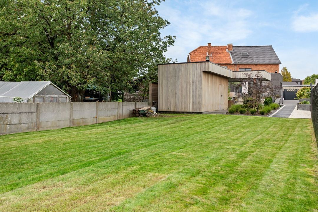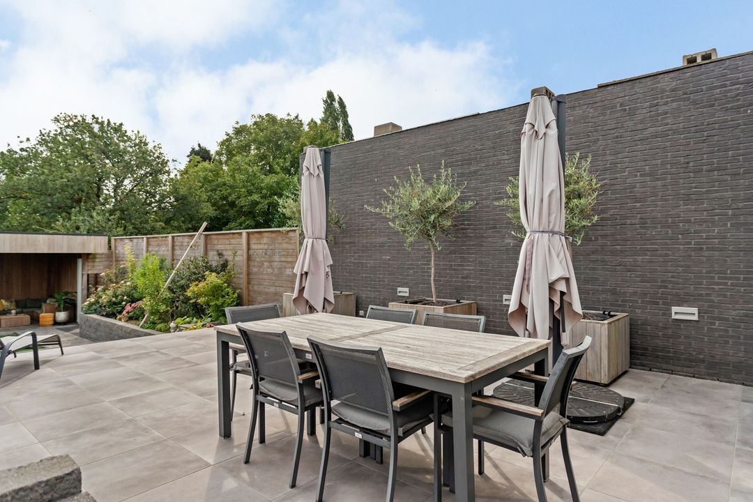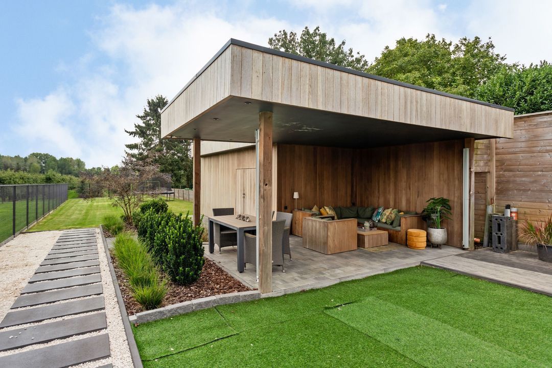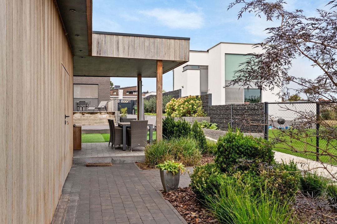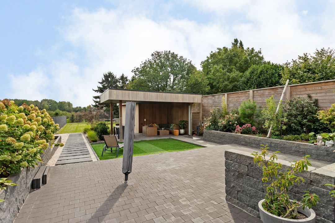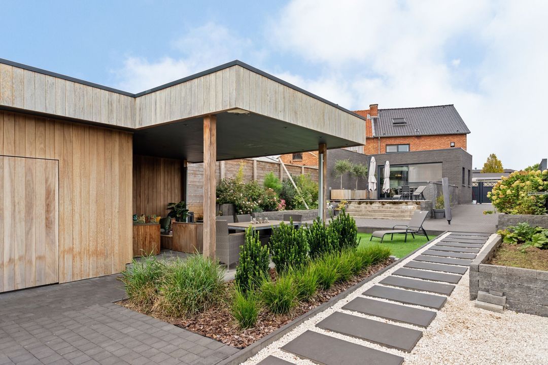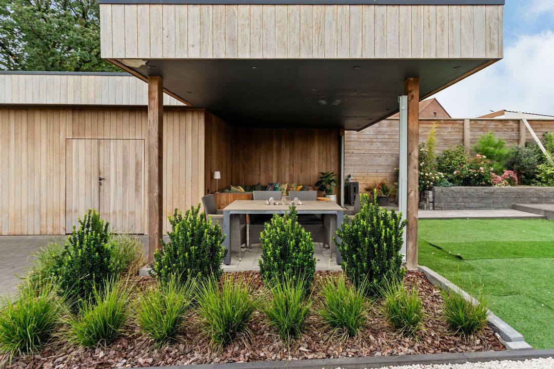 De zuidgerichte tuin is smaakvol aangelegd en vormt een heerlijke plek om te ontspannen. Het overdekte terras met volledig geïsoleerde tuinberging in Thermowood biedt extra comfort, terwijl de gemakkelijke achteringang en de ruime oprit met poort het geheel compleet maken.
