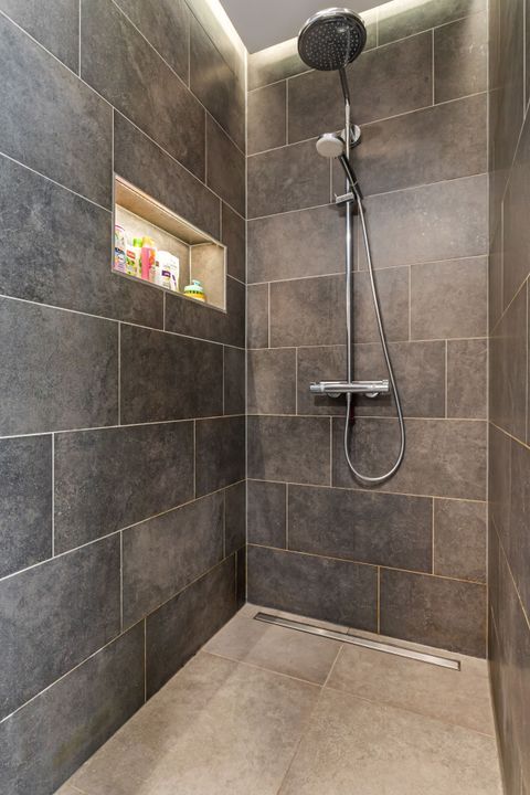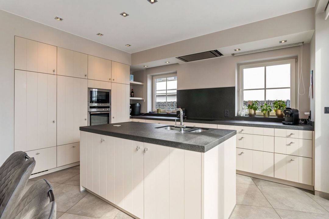 Bij binnenkomst leidt de inkomhal met gastentoilet naar de ruime leefruimte met open keuken. Met een totale oppervlakte van ruim 64 m² vormt dit een heerlijk open en licht geheel, waarbij grote raampartijen zorgen voor een prachtig zicht op het groen. De landelijke keuken met eiland is uitgerust met alle moderne gemakken, waaronder een inductiekookplaat, granieten werkblad, oven, magnetron, vaatwasser en koelkast. Via de schuifpui bereikt u het royale terras, waar het in alle rust genieten is van de zon en de tuin. Aansluitend bevindt zich een praktische berging met wasbak en inbouwkasten, evenals een stijlvolle badkamer met ligbad, inloopdouche en dubbel wastafelmeubel.