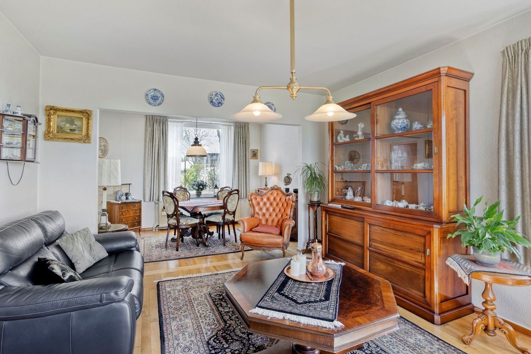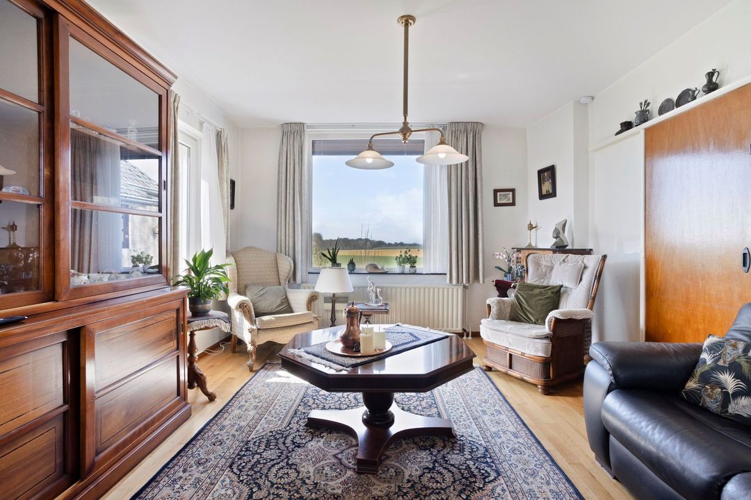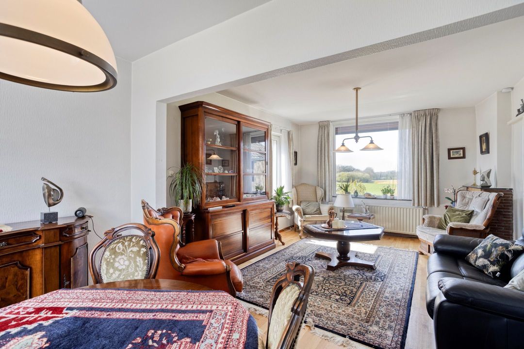De woonkamer van ca. 27 m² is een warme en sfeervolle leefruimte, die dankzij de grote raampartijen aan zowel de voor- als achterzijde wordt overspoeld door natuurlijk licht. De achterramen bieden een prachtig uitzicht over de omliggende weilanden en creëren een gevoel van rust en ruimte. De houten vloer en twee authentieke schouwen dragen bij aan de klassieke en uitnodigende uitstraling van deze ruimte.