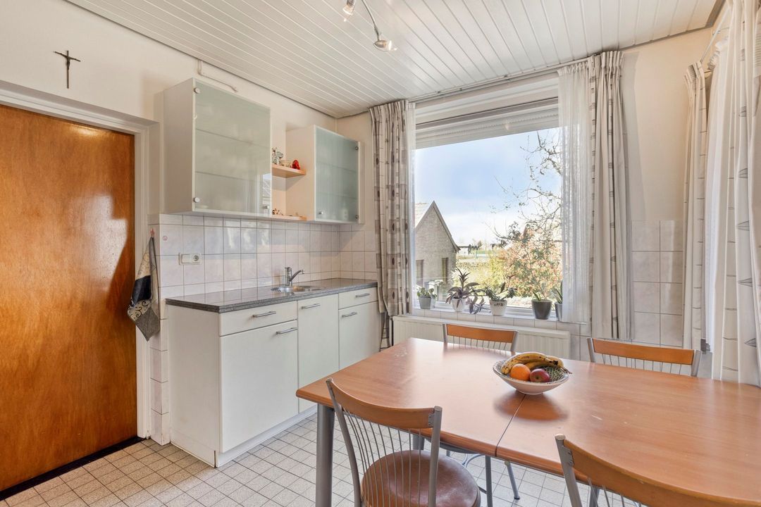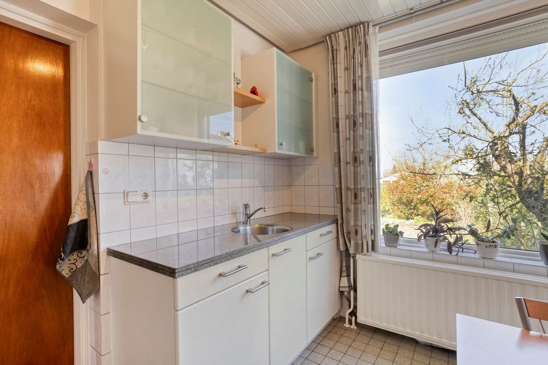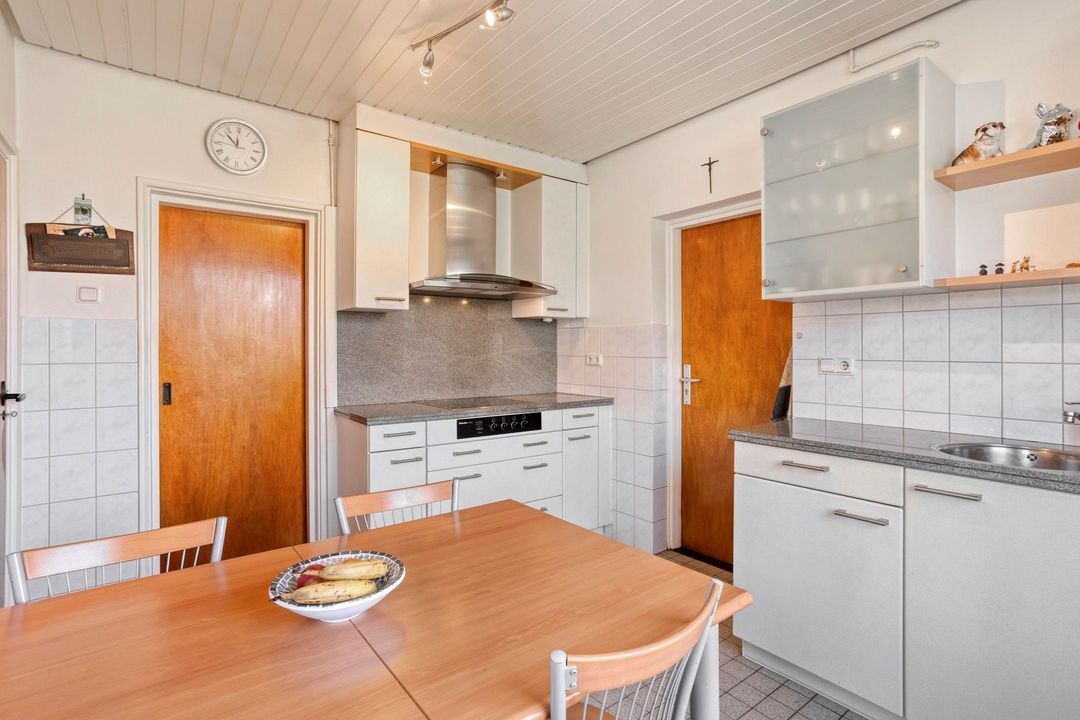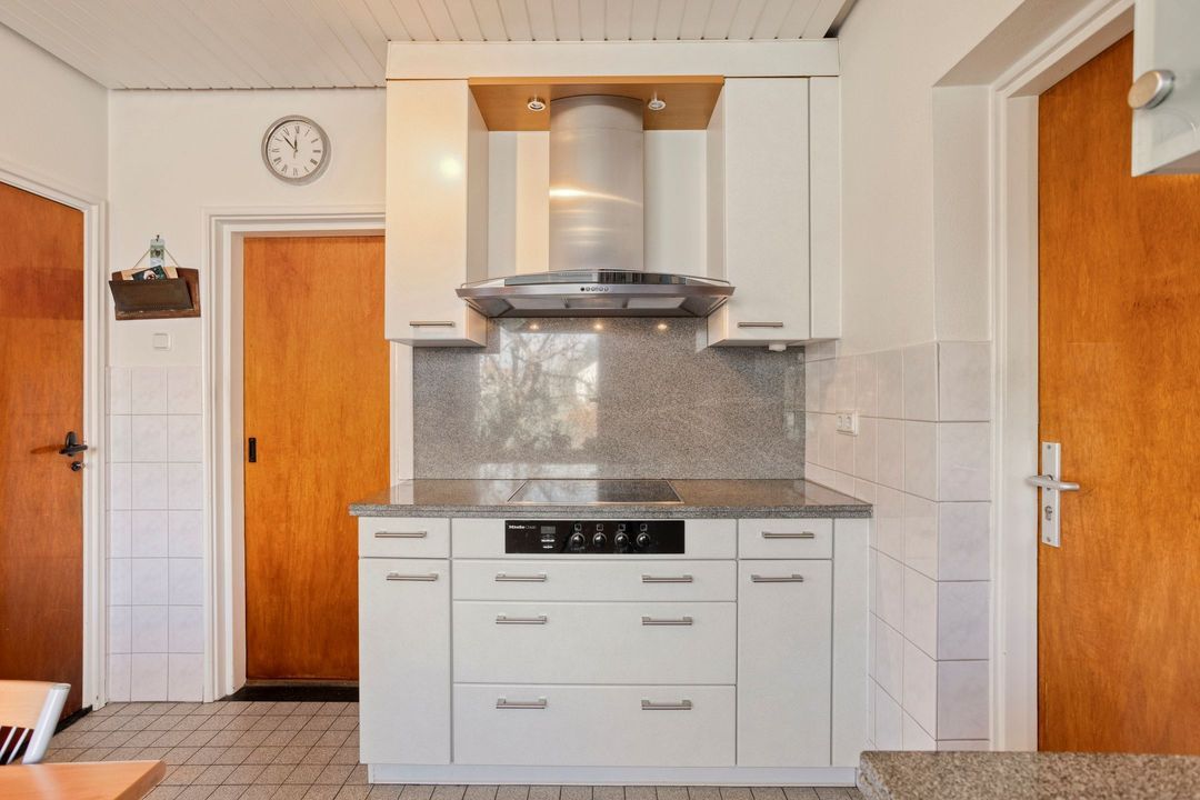 De nette keuken (ca. 10,5 m²) bevindt zich aan de achterzijde van de woning en is voorzien van een tegelvloer. De keuken is uitgerust met een elektrische kookplaat en afzuigkap en biedt directe toegang tot de bijkeuken.