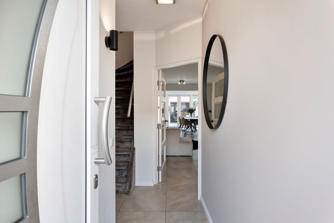 De royale en sfeervolle woonkamer met open keuken heeft een totale oppervlakte van circa 46 m² en is afgewerkt met dezelfde fraaie tegelvloer als in de entree, wat zorgt voor een rustige en uniforme uitstraling. Dankzij de grote raampartijen aan de voorzijde en de openslaande deuren met lichtstraat aan de achterzijde geniet deze leefruimte van een prettige, natuurlijke lichtinval gedurende de hele dag. De deuren aan de achterzijde bieden direct toegang tot de tuin en creëren een mooie verbinding tussen binnen en buiten.