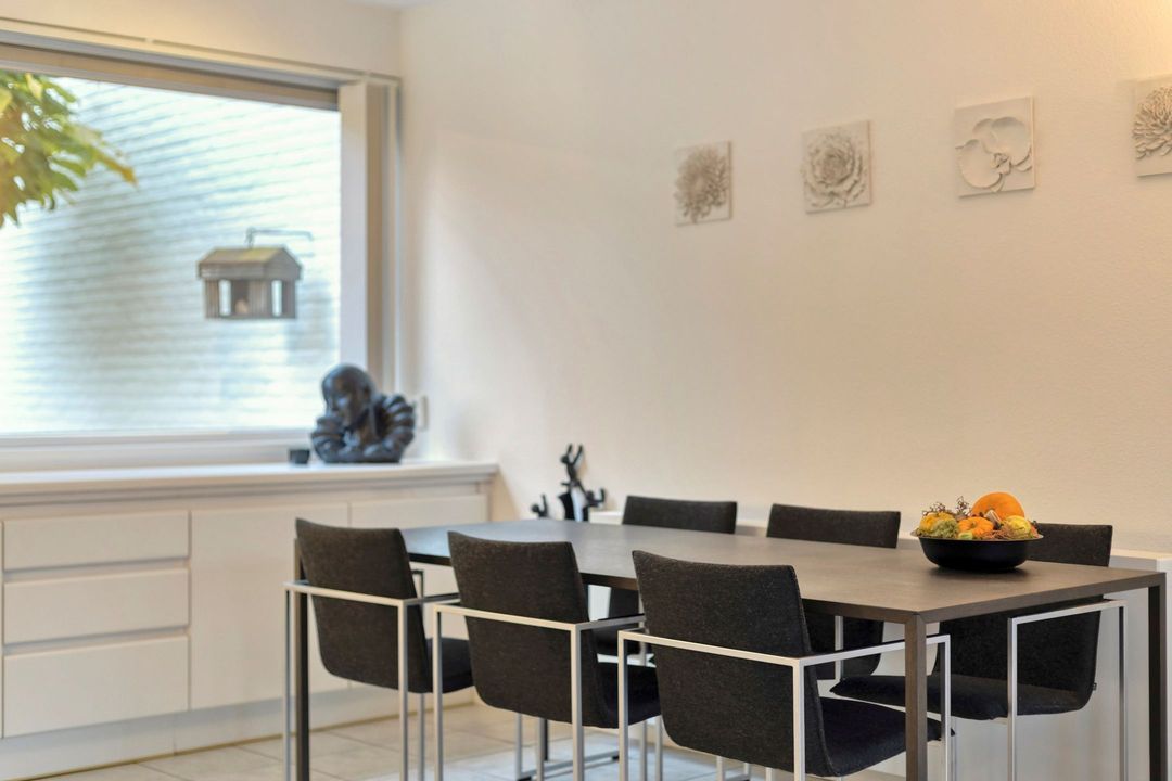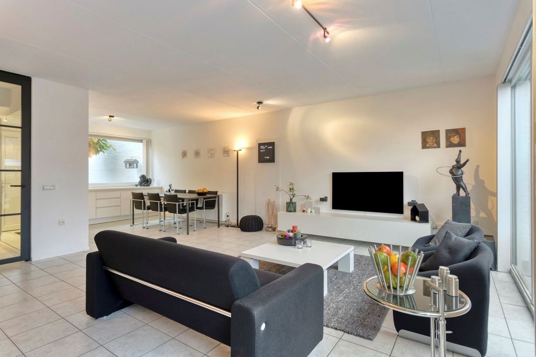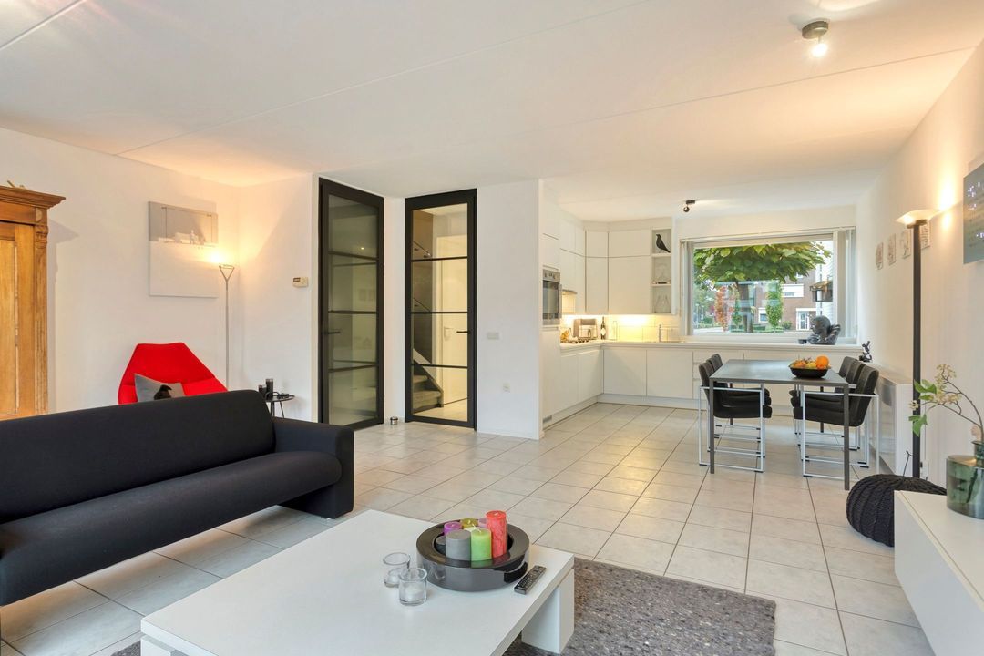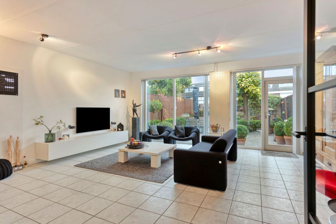 De woonkamer, bereikbaar via een fraaie zwartstalen deur, vormt een lichte en aangename leefruimte van ca. 41,5 m², inclusief de open keuken. Meerdere grote raampartijen zorgen voor veel daglicht en een mooie verbinding met de achtertuin, waardoor binnen en buiten naadloos in elkaar overlopen. In de woonkamer bevindt zich bovendien een praktische kastruimte, eveneens voorzien van een zwartstalen deur, ideaal als opbergruimte of voorraadkast.