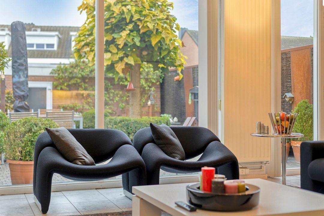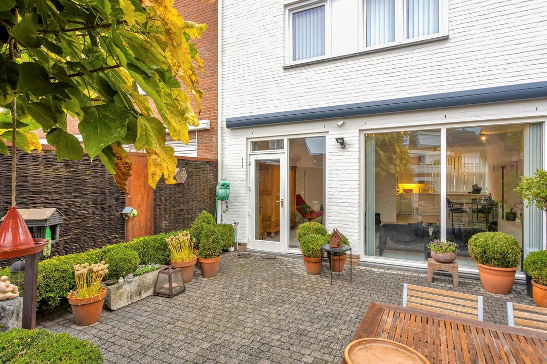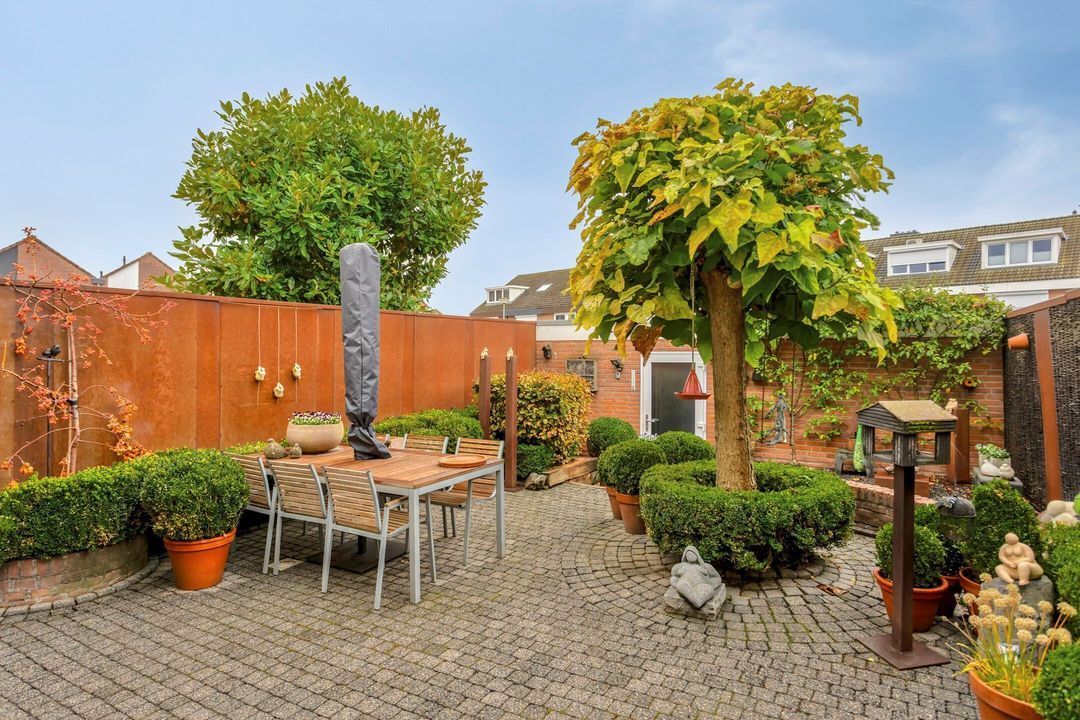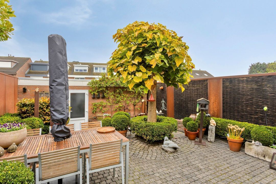 De royale en sfeervolle achtertuin is volledig omheind en onderhoudsvriendelijk aangelegd. Met een verzorgd terras en groene borders vormt het een ideale plek om te ontspannen, te genieten van alle rust, of een gezellige buitenruimte te creëren voor het hele gezin. Het uitschuifbare zonnescherm grenst direct aan de woonkamer en maakt het buitenleven nog aangenamer. De tuin is toegankelijk vanuit zowel de woonkamer als de garage en biedt volop mogelijkheden voor een persoonlijke inrichting.