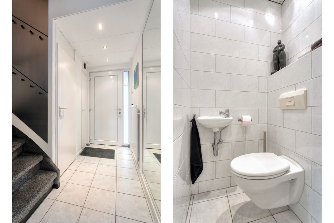 Bij binnenkomst treft u de ruime entree van ca. 5,5 m², voorzien van een nette tegelvloer. Vanuit de entree heeft u toegang tot de meterkast, de toiletruimte, de woonkamer en de trap naar de eerste verdieping. De betegelde toiletruimte is uitgerust met een modern hangcloset en een fonteintje.