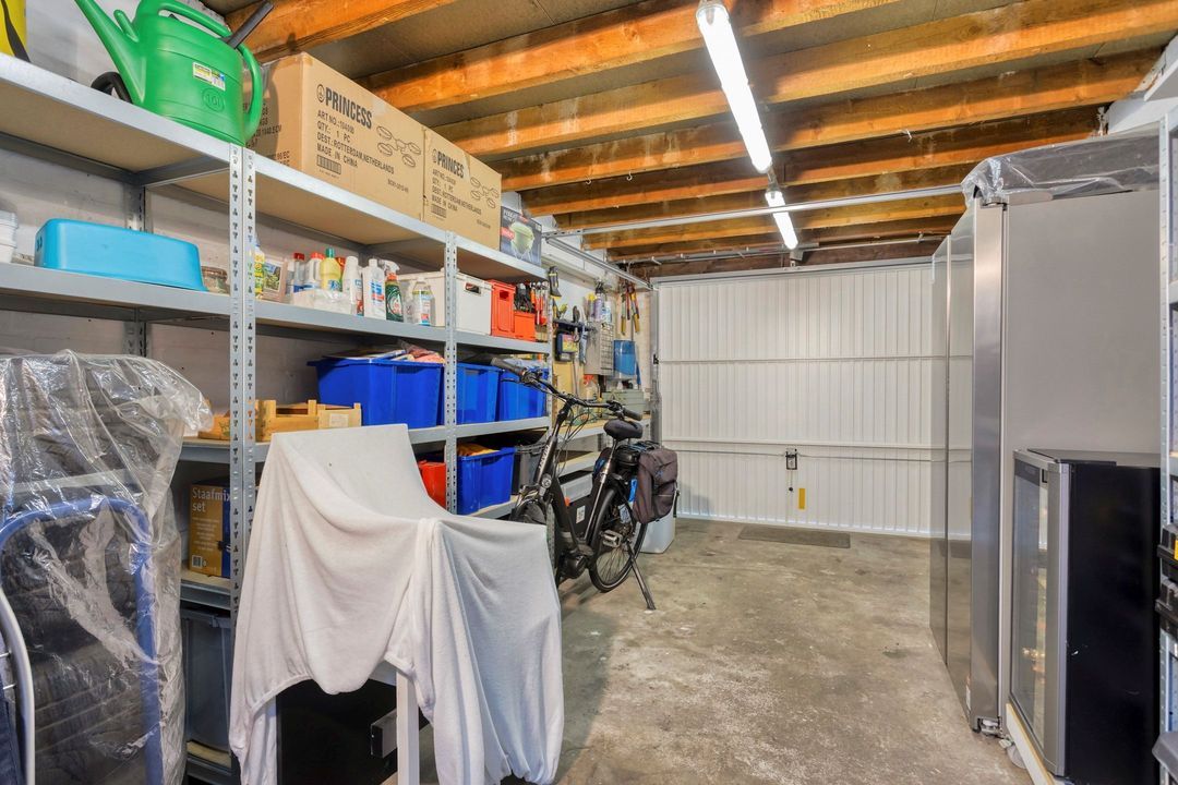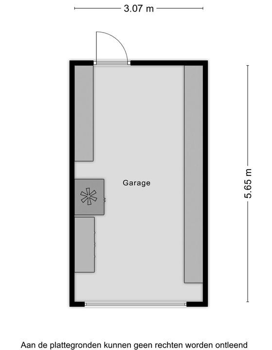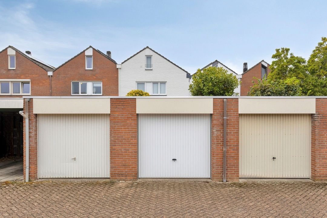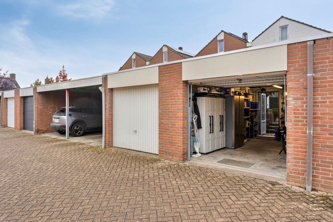 De woning beschikt over een ruime garage van ca. 17 m², bereikbaar vanuit de tuin en via een handmatig bedienbare kantelpoort aan de straatzijde. De garage is voorzien van elektra en water en biedt voldoende ruimte voor een auto, fietsen of extra opslag.