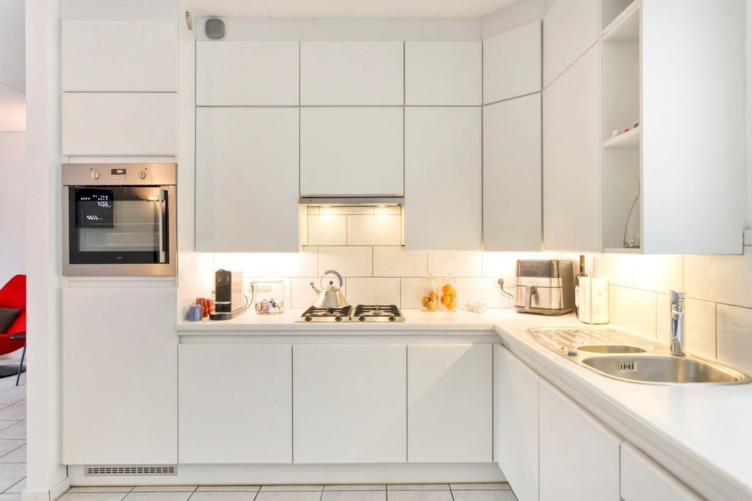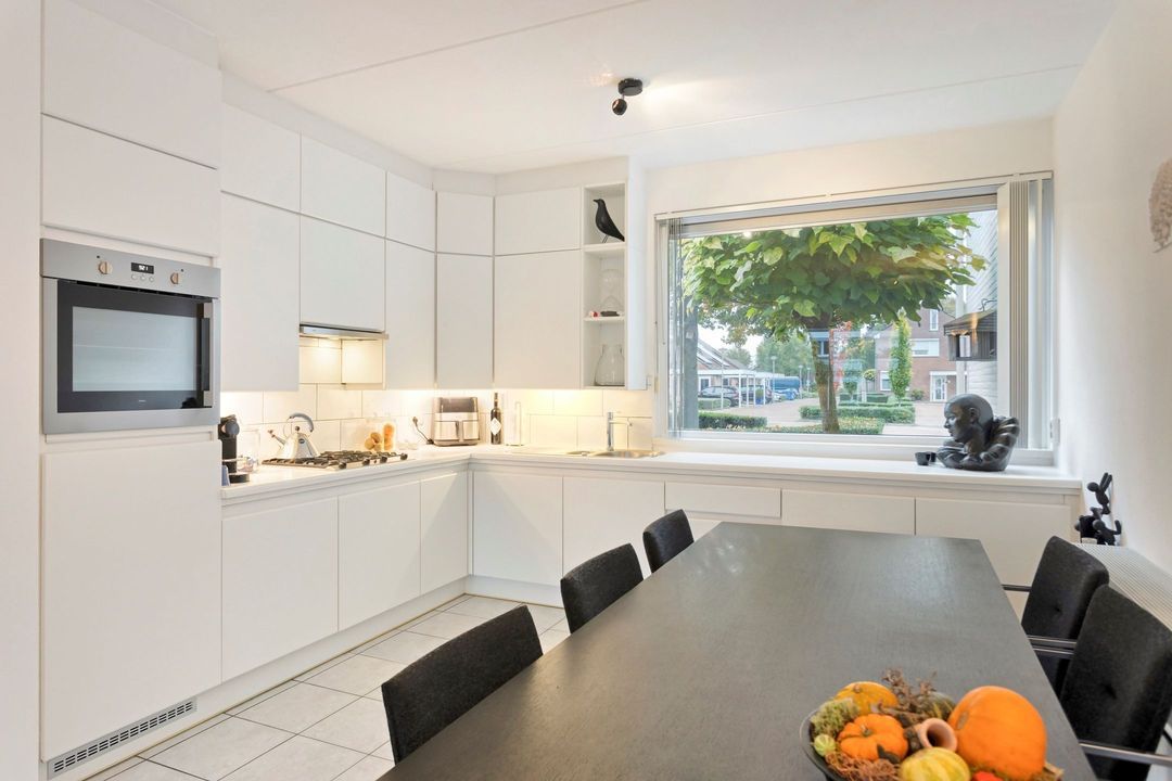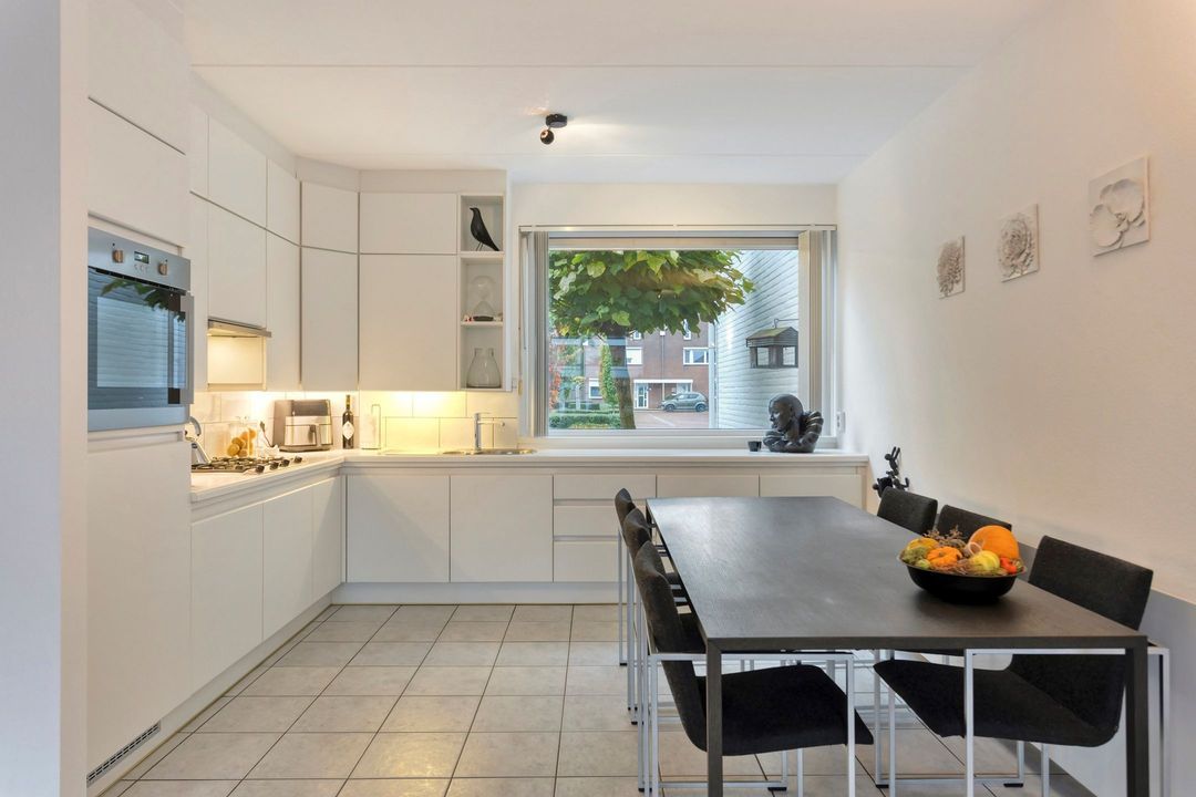 De L-vormige keuken aan de voorzijde van de woning is praktisch ingedeeld en volledig uitgerust met een 4-pits gasfornuis, afzuigkap, oven, vaatwasser en veel werk- en opbergruimte. Het grote raam biedt contact met de straat en zorgt voor een licht en luchtig werkplekje.