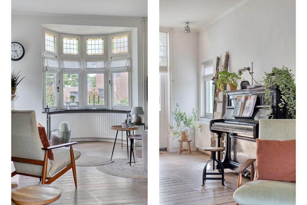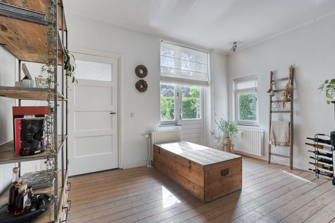 Het is mooi binnenkomen in de ruime woonkamer van 33 m² groot. Ook hier valt de charme van de woning direct op door de houten vloer, de zandstenen schouw in het midden van de ruimte en de erker met glas-in-loodramen aan de voorzijde van de woning. Grote raampartijen zorgen voor veel natuurlijk licht, waardoor een fijne leefruimte ontstaat.