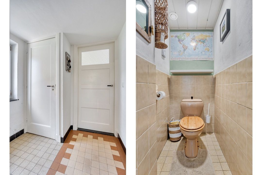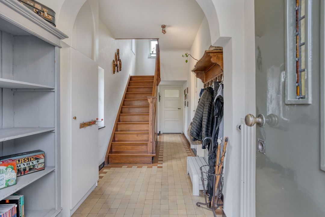 Bij binnenkomst valt het karakter en de ruime opzet van de woning direct op. De entree van ca. 11,5 m² is licht en sfeervol, voorzien van een voordeur met glas-in-loodramen, een originele tegelvloer, een eikenhouten trap en een hoog plafond. In de entree bevindt zich de meterkast, de toegang tot de woonkamer, de toegang tot de eetkamer en de toiletruimte. Tevens bevindt zich hier de trapopgang naar de eerste verdieping en de trap naar de kelder. De nette toiletruimte is gedeeltelijk betegeld en voorzien van een staand closet.