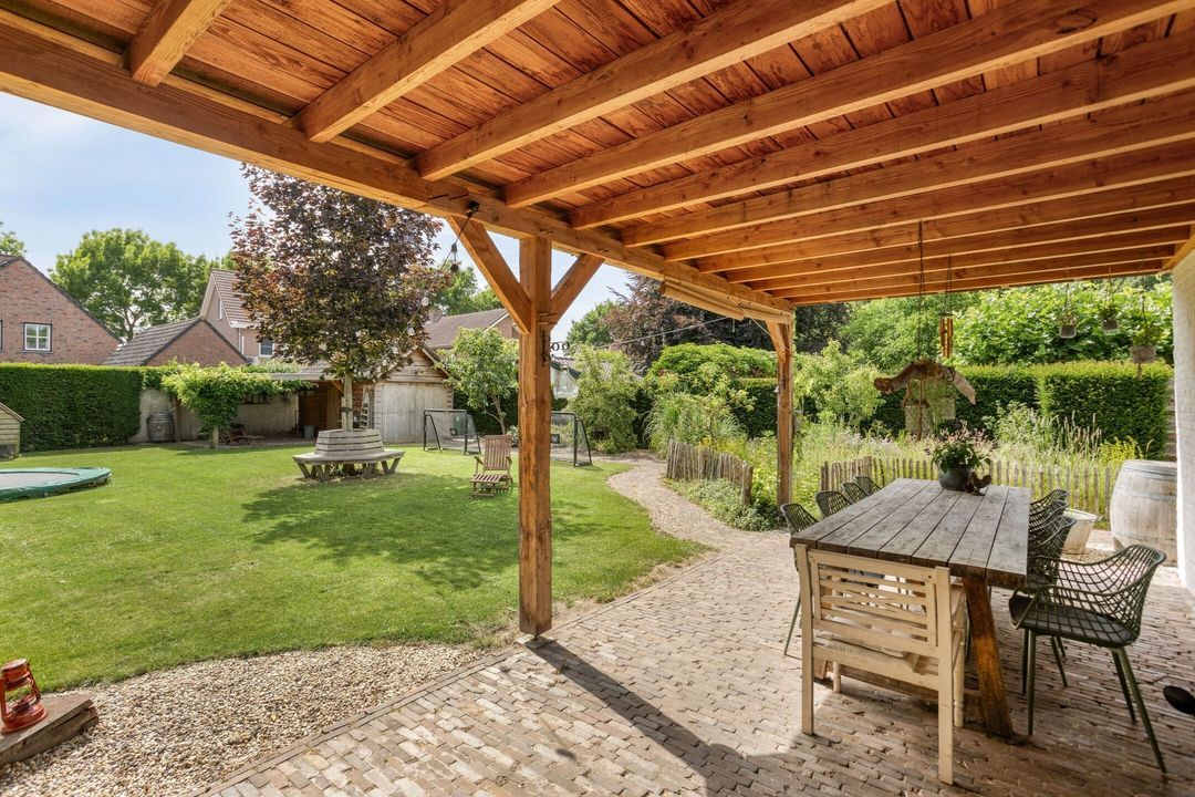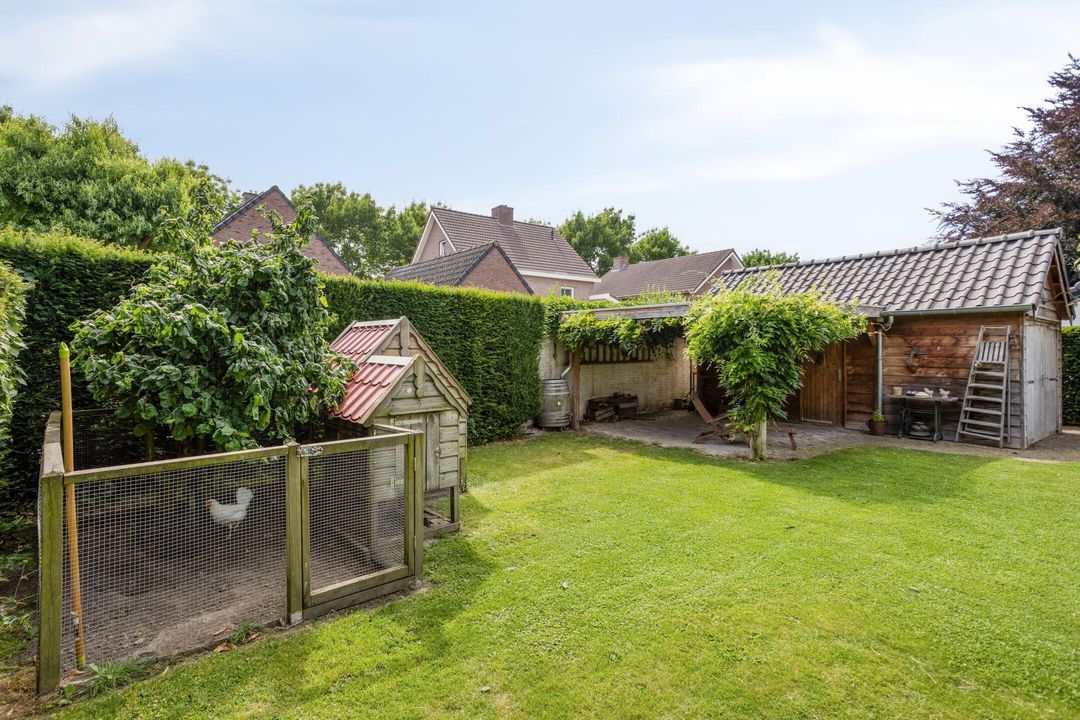 De woning is voorzien van een royale en fraai aangelegde achtertuin met veel privacy. De tuin is te bereiken via een deur in de keuken, een deur in de garage of de handige zijingang. De tuin is ingericht met een combinatie van een terras, een ruim gazon en plantenborders. Dankzij de royale opzet is er volop ruimte om te ontspannen, buiten te eten of voor kinderen om te spelen. De overkapping (ca. 34 m²), grenzend aan de garage en keuken, biedt de mogelijkheid om op warme dagen beschut in de schaduw te zitten en comfortabel van het buitenleven te genieten. Achterin de tuin bevindt zich een houten berging van ca. 17 m² met een overkapping, ideaal voor het bergen van tuingereedschap, materialen of het stallen van fietsen.