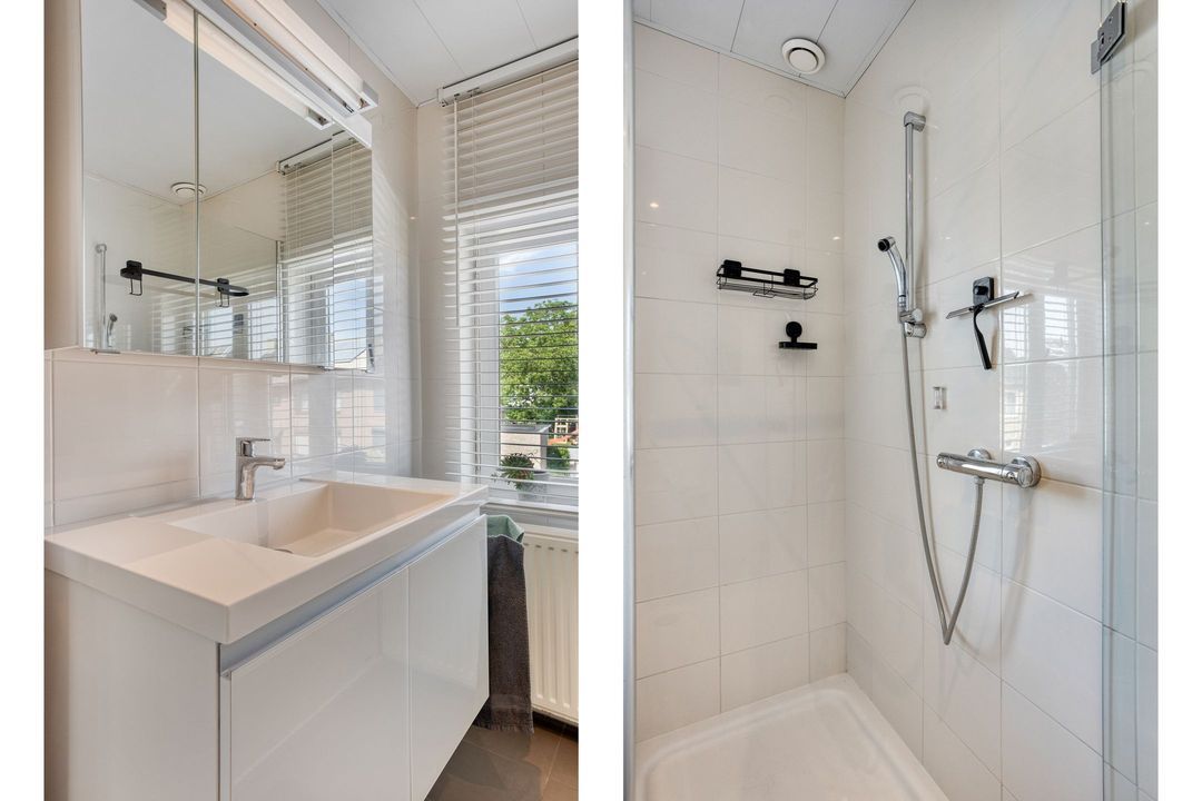 • Badkamer: De moderne, betegelde badkamer (ca. 5 m²) is voorzien van een douchecabine, een wastafelmeubel en een staand closet.