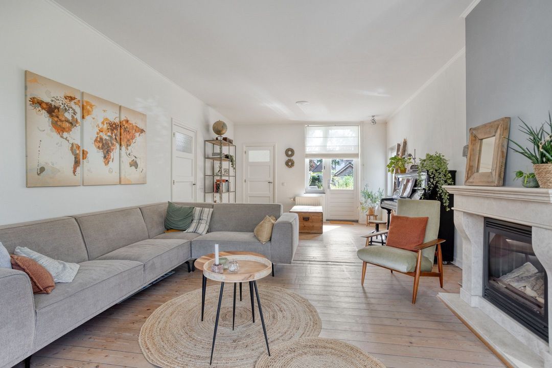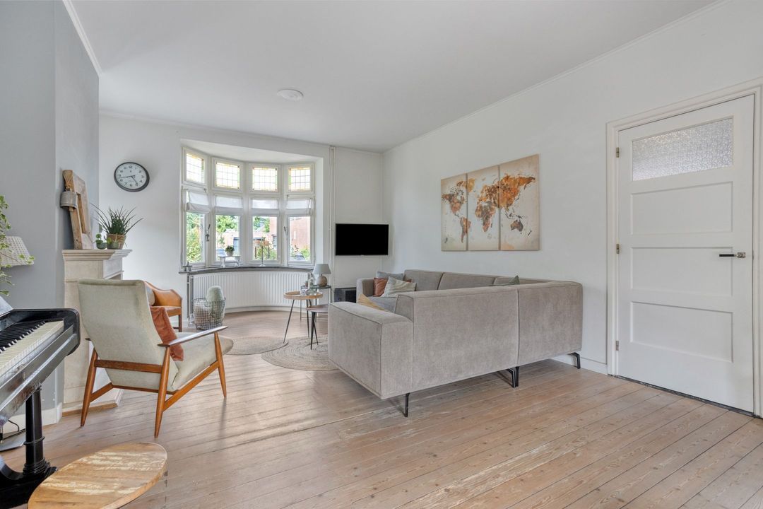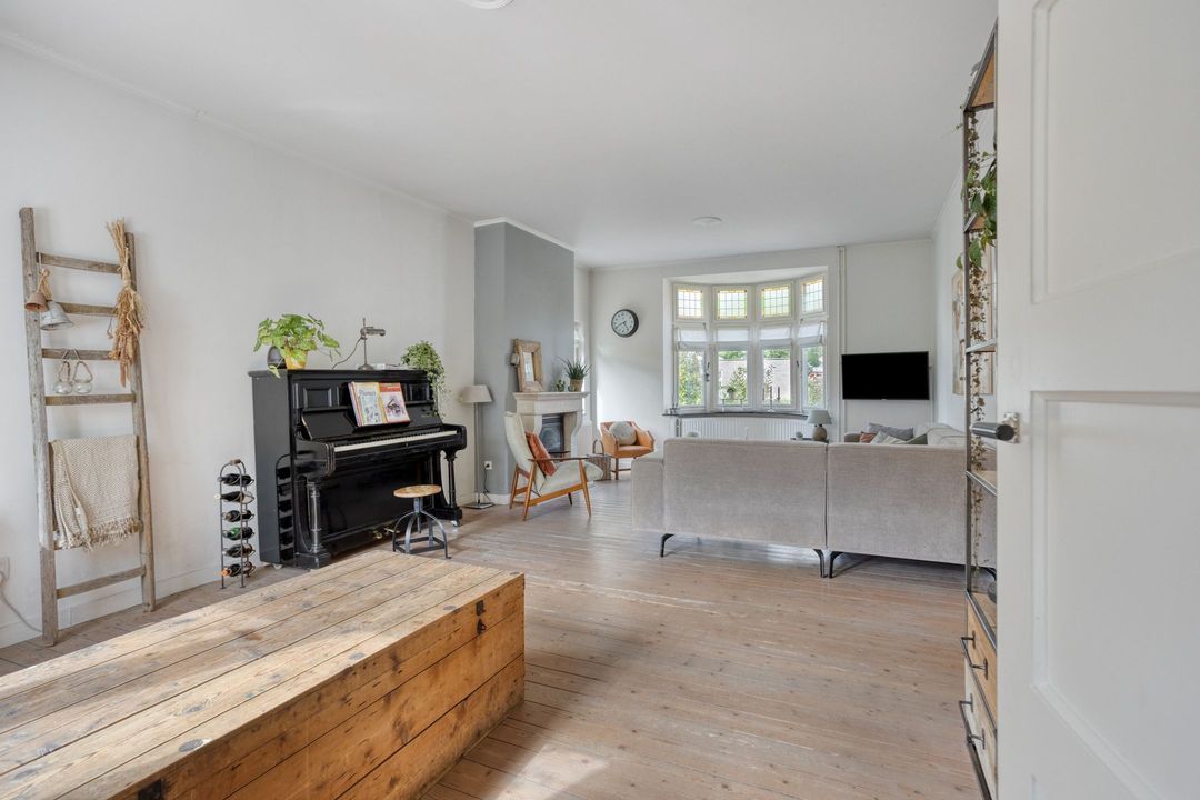 Het is mooi binnenkomen in de ruime woonkamer van 33 m² groot. Ook hier valt de charme van de woning direct op door de houten vloer, de zandstenen schouw in het midden van de ruimte en de erker met glas-in-loodramen aan de voorzijde van de woning. Grote raampartijen zorgen voor veel natuurlijk licht, waardoor een fijne leefruimte ontstaat.
