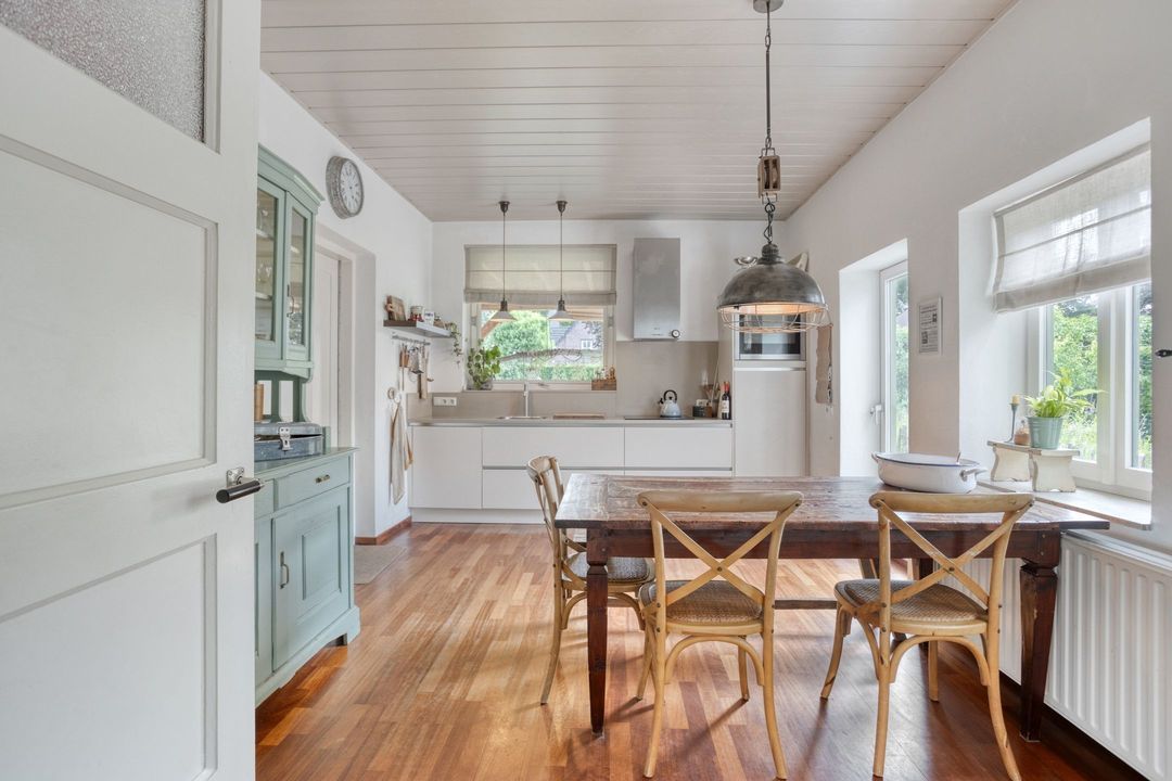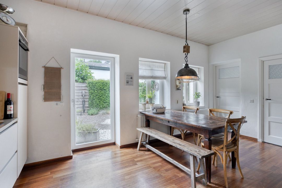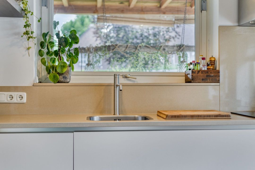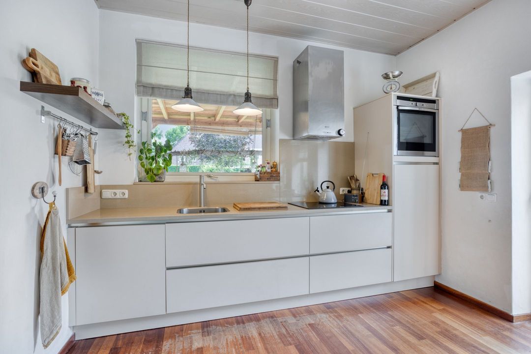 De keuken van ca. 18 m² is modern uitgevoerd met witte greep loze fronten en uitgerust met een inductiekookplaat, afzuigkap, combi-oven, koelkast en vaatwasser. Grote ramen en een deur naar de tuin zorgen voor een mooie verbinding tussen binnen en buiten, waardoor de keuken een lichte en open uitstraling heeft.