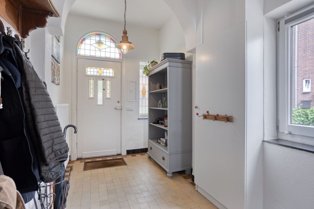 Bij binnenkomst valt het karakter en de ruime opzet van de woning direct op. De entree van ca. 11,5 m² is licht en sfeervol, voorzien van een voordeur met glas-in-loodramen, een originele tegelvloer, een eikenhouten trap en een hoog plafond. In de entree bevindt zich de meterkast, de toegang tot de woonkamer, de toegang tot de eetkamer en de toiletruimte. Tevens bevindt zich hier de trapopgang naar de eerste verdieping en de trap naar de kelder. De nette toiletruimte is gedeeltelijk betegeld en voorzien van een staand closet.