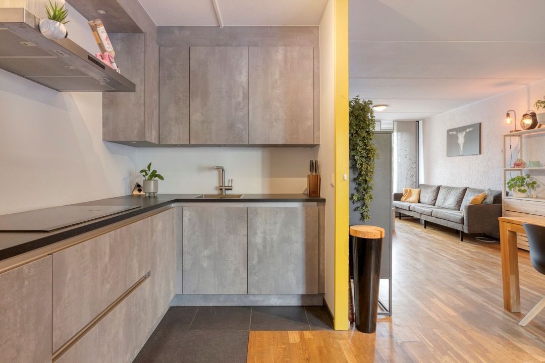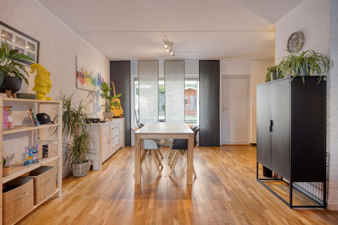 De woonkamer met open keuken heeft een oppervlakte van circa 39 m² en straalt een warme en uitnodigende sfeer uit. De ruimte geniet van veel natuurlijke lichtinval en is afgewerkt met een fraaie parketvloer, wat bijdraagt aan een lichte en prettige leefomgeving. Vanuit de woonkamer is tevens de trapopgang naar de eerste verdieping bereikbaar.
