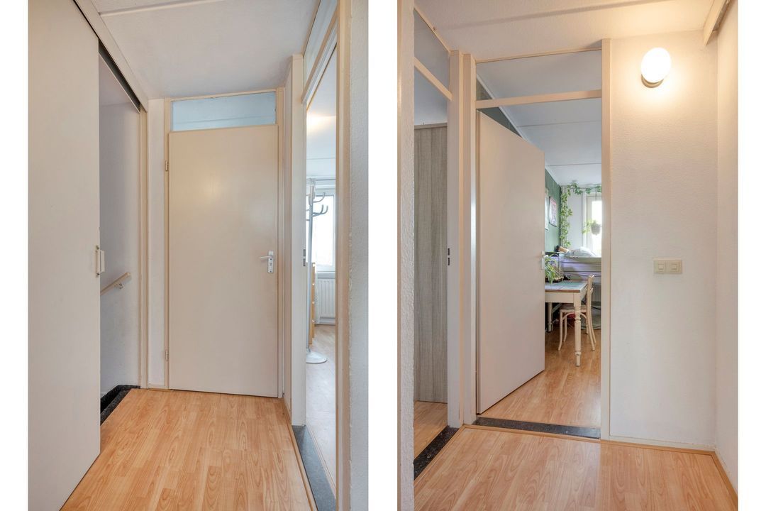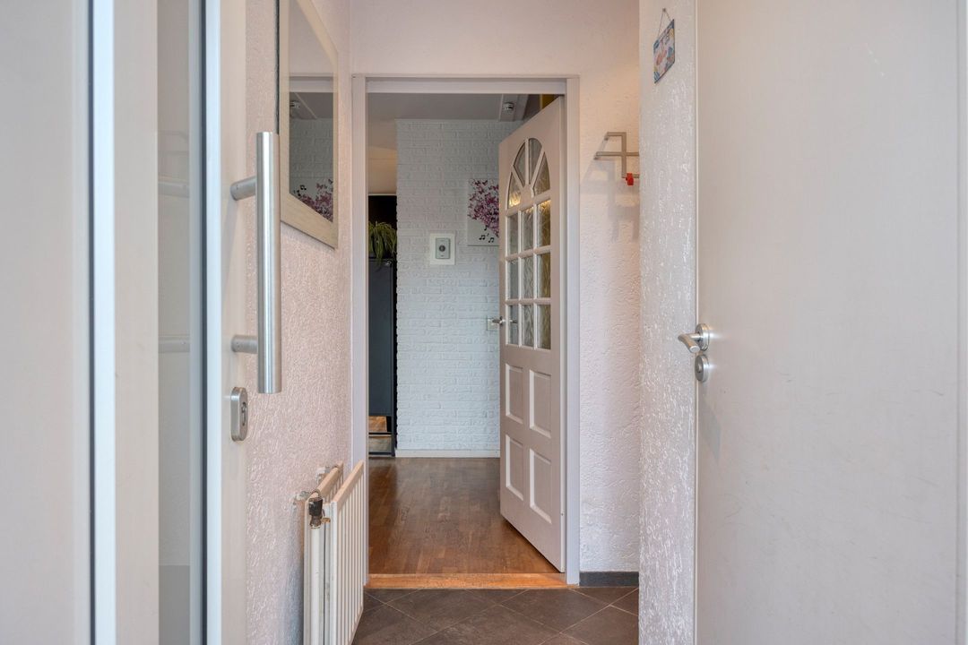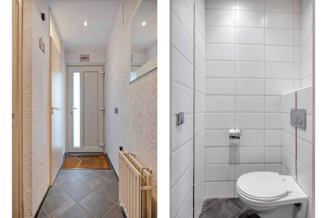 U betreedt de woning via een verzorgde entree met een nette tegelvloer. Vanuit de hal heeft u toegang tot de meterkast, de toiletruimte en de woonkamer met open keuken. De toiletruimte is volledig betegeld en voorzien van een modern hangcloset.