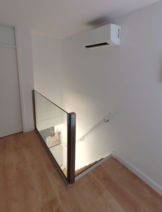 Via de open trap in de woonkamer bereikt u de ruime overloop van ca. 8,5 m², voorzien van een nette laminaatvloer. Het hoge raam aan de voorzijde zorgt ook hier voor een mooie lichtinval. Bovendien is de overloop uitgerust met airconditioning en een stijlvolle glazen balustrade. Op deze verdieping bevinden zich drie slaapkamers, de badkamer en een praktische berging/cv-ruimte.