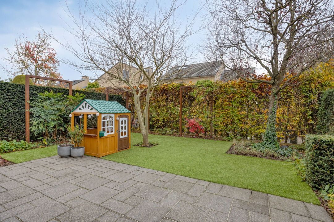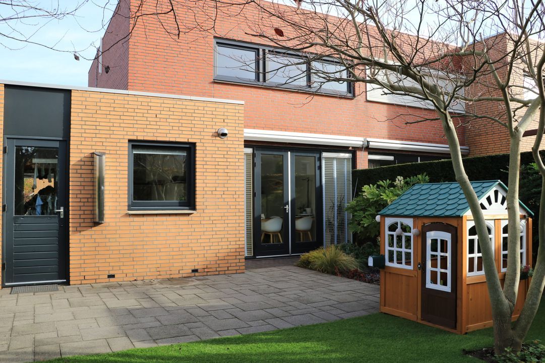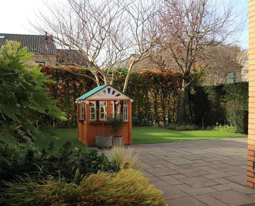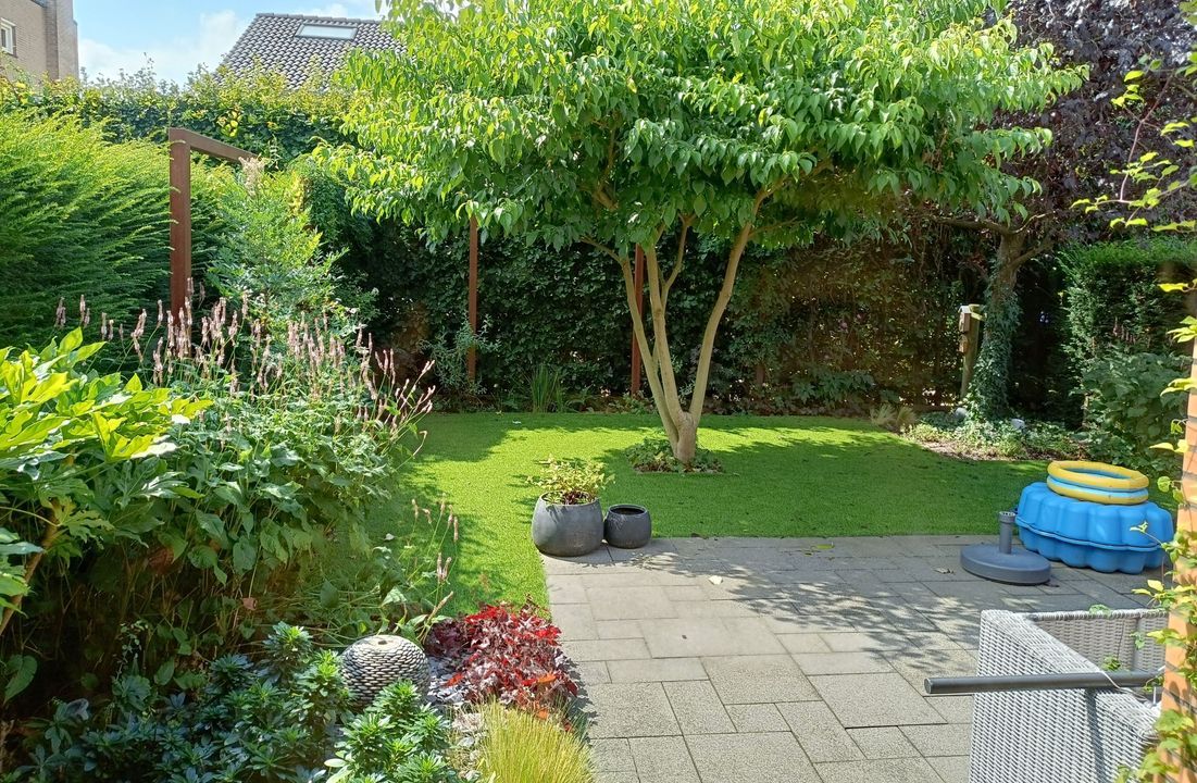 De achtertuin is bereikbaar vanuit zowel de woonkamer als de garage/bijkeuken en is met zorg en smaak aangelegd. Gelegen op het zuidwesten, geniet u hier van veel zon én privacy. De tuin bestaat uit een combinatie van een terras, een verzorgd gazon, cortenstalen tuinelementen en diverse beplantingen die voor een prettige sfeer zorgen. Het zonnescherm bij de woonkamer biedt schaduw op warme dagen, waardoor dit een ideale plek is om te ontspannen, te borrelen of uitgebreid te tafelen met familie en vrienden.