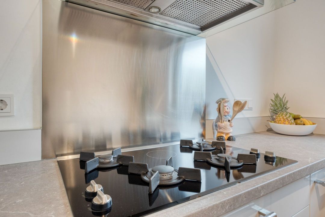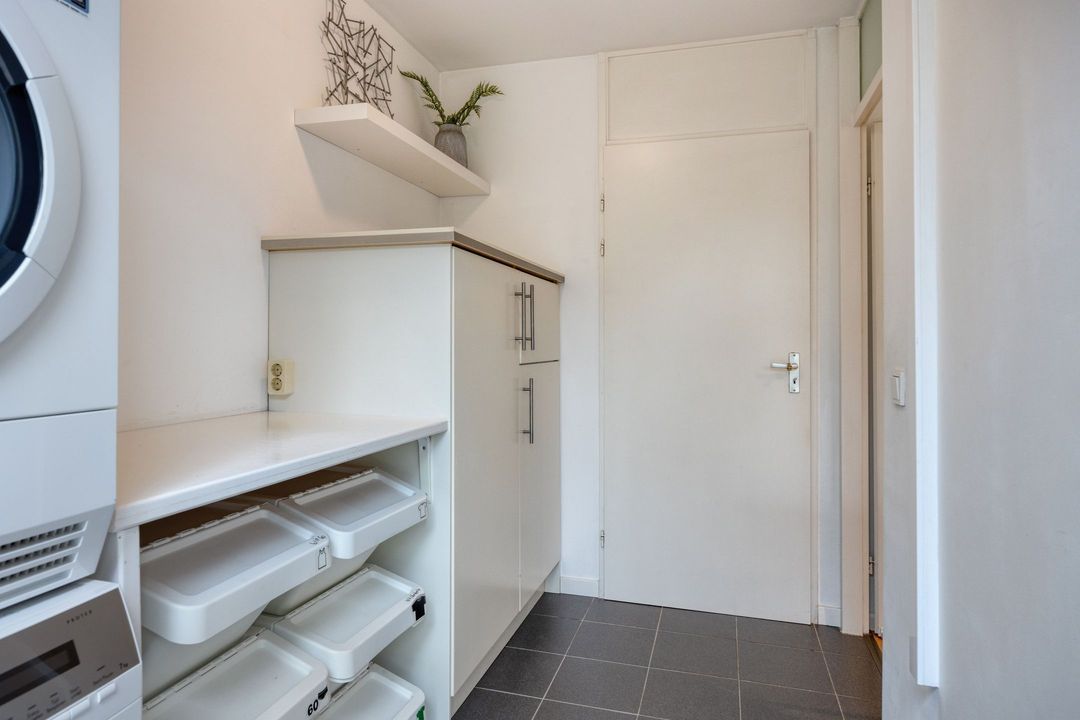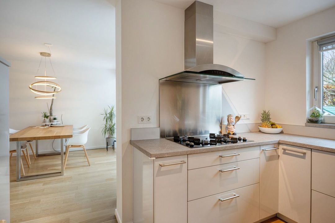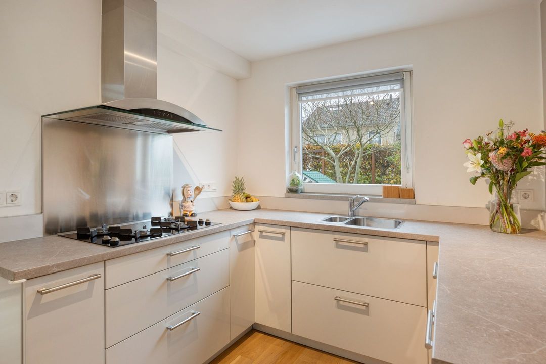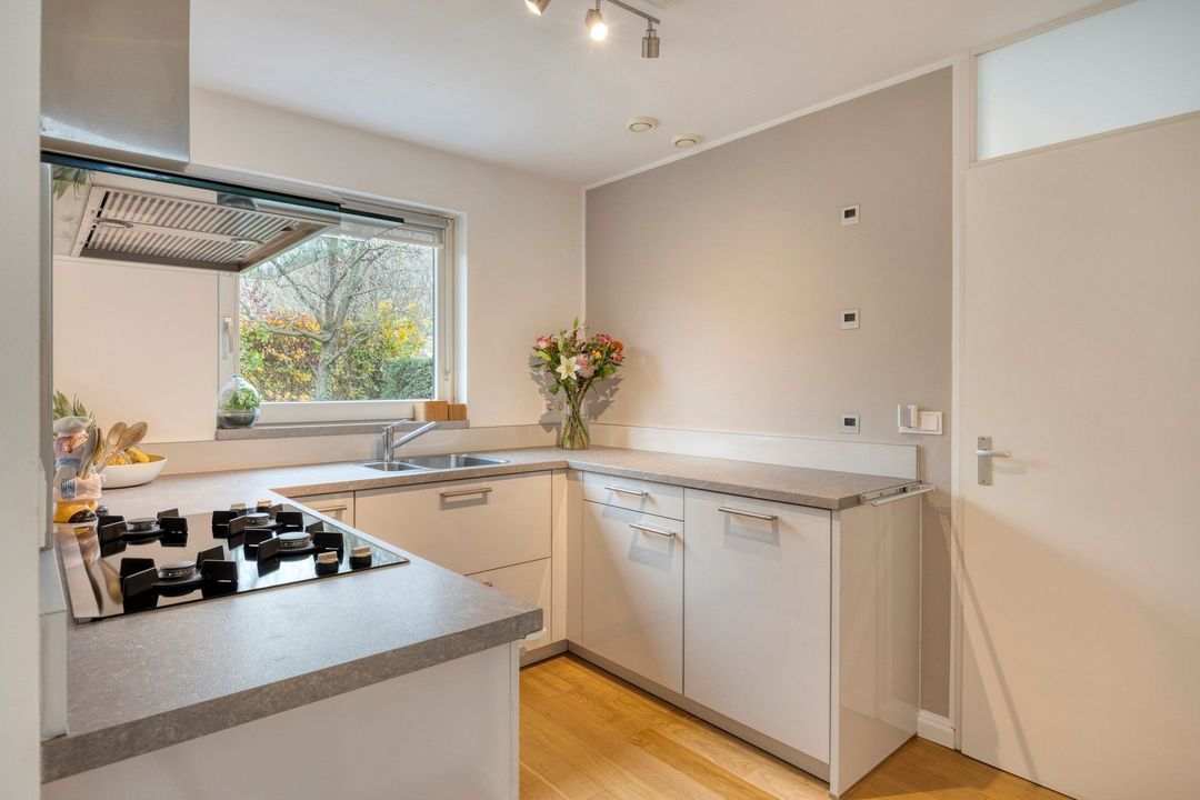 De semi-open keuken ligt aan de tuinzijde en is uitgerust met een lichtgrijs composieten werkblad. De keuken beschikt over een 4-pits gaskookplaat, afzuigkap, combi-oven, koelkast, vaatwasser en elektrische boiler. Vanuit de keuken loopt u door naar de praktische bijkeuken van ca. 5 m² met witgoedaansluitingen, inbouwvriezer, veel bergruimte en directe toegang tot zowel de achtertuin als de garage.