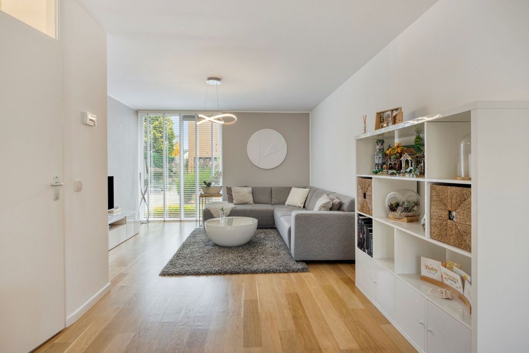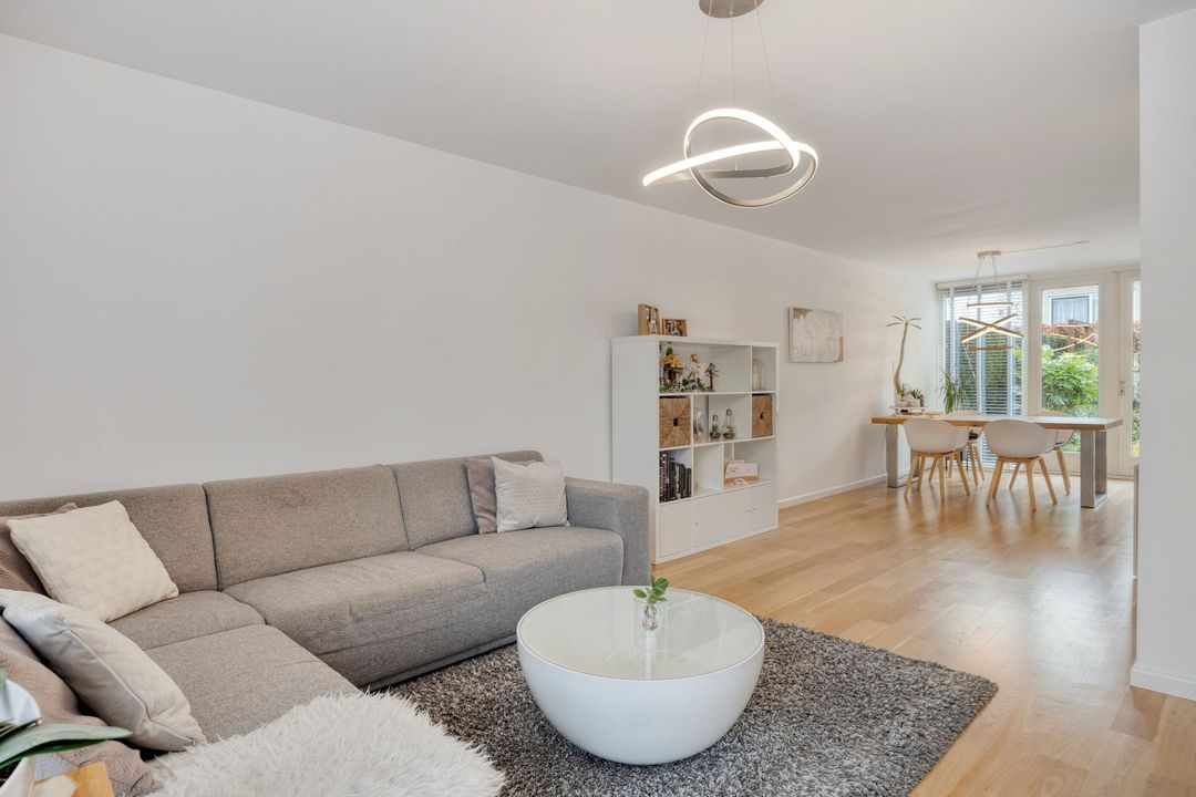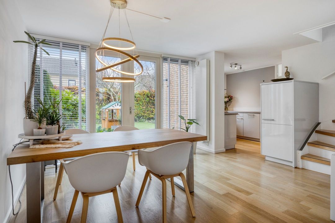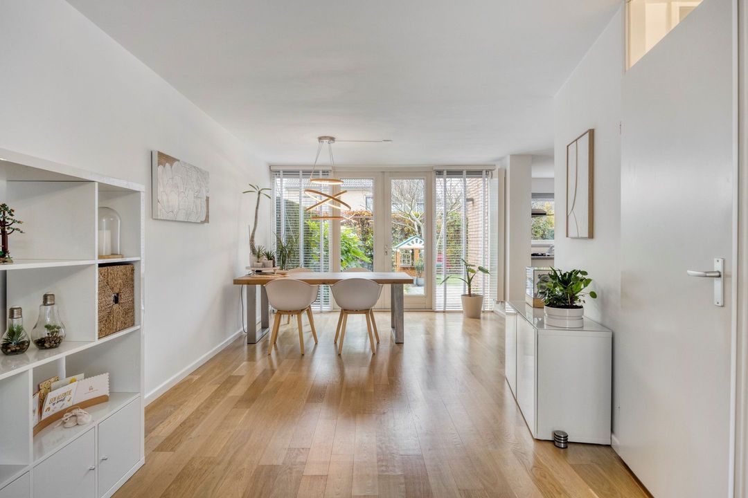 De woonkamer vormt een uitnodigende leefruimte van circa 45 m², met een mooie houten parketvloer die zorgt voor een warme en stijlvolle uitstraling. Dankzij het grote raam aan de voorzijde en de royale glazen pui met openslaande deuren aan de tuinzijde geniet deze woonkamer van een prachtige lichtinval gedurende de hele dag en staat het hele jaar in contact met de nette voor- en achtertuin. Een heerlijke plek voor zowel dagelijkse momenten als gezellige avonden.