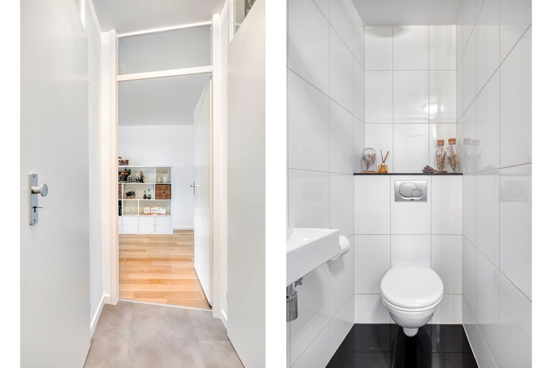 U wordt verwelkomd in een lichte en ruime entree, afgewerkt met een fraaie PVC tegelvloer. Vanuit de hal heeft u toegang tot de meterkast, de garderobe, de geheel betegelde toiletruimte met wandcloset en fonteintje, en uiteraard tot de woonkamer met semi-open keuken.