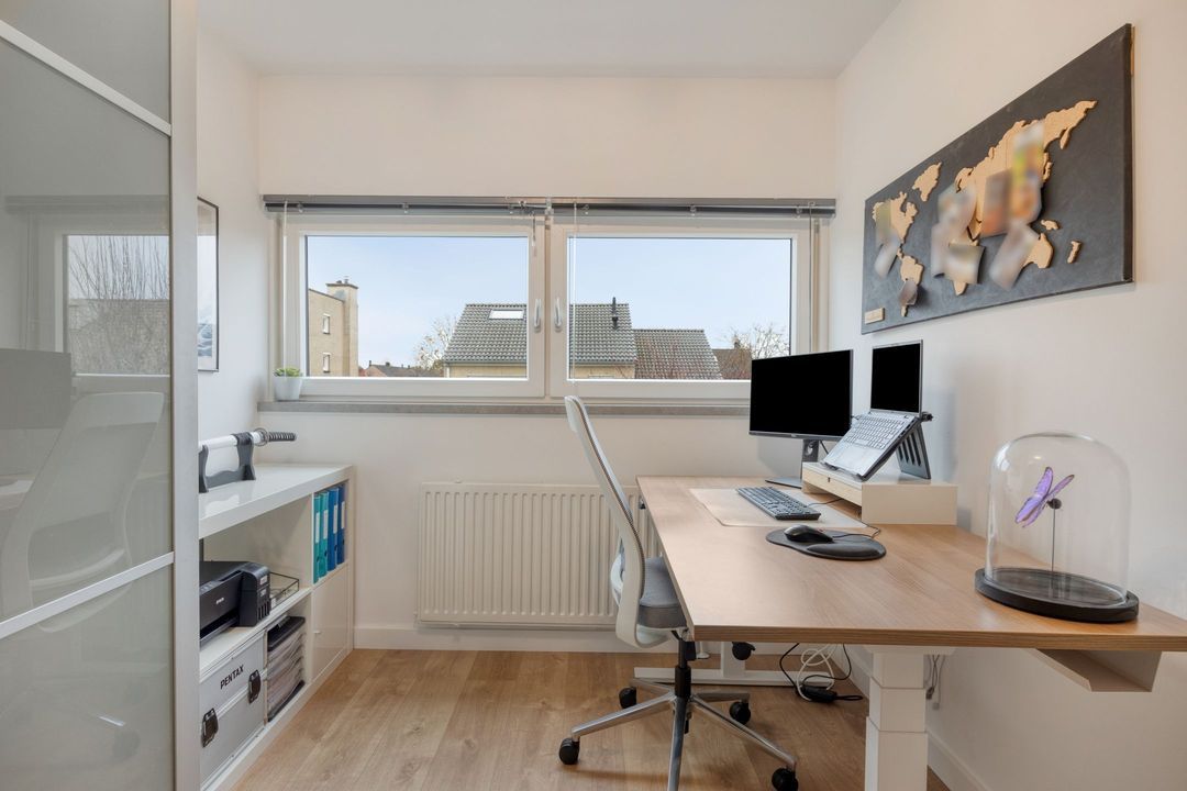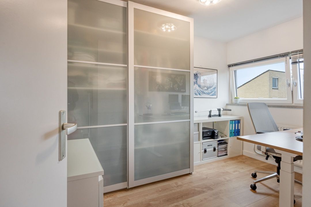 Via de open trap in de woonkamer bereikt u de ruime overloop van ca. 8,5 m², voorzien van een nette laminaatvloer. Het hoge raam aan de voorzijde zorgt ook hier voor een mooie lichtinval. Bovendien is de overloop uitgerust met airconditioning en een stijlvolle glazen balustrade. Op deze verdieping bevinden zich drie slaapkamers, de badkamer en een praktische berging/cv-ruimte.
