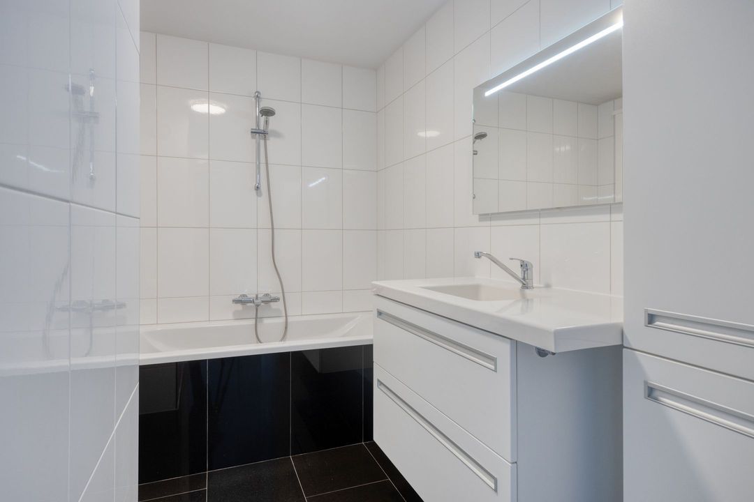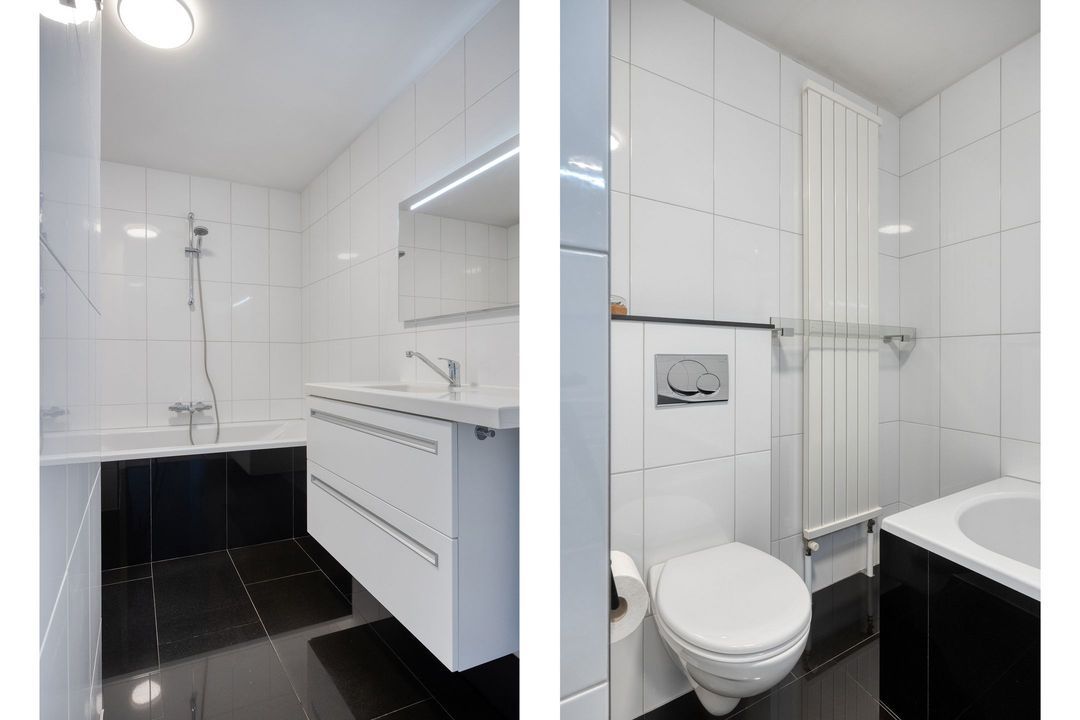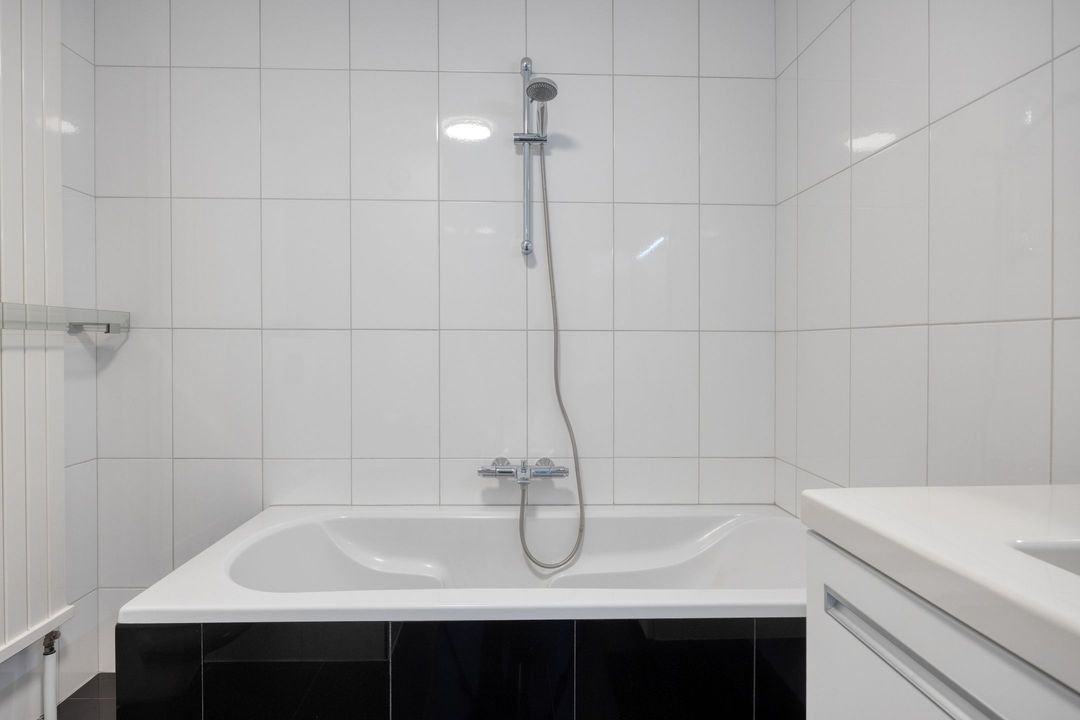 • Badkamer: De betegelde badkamer is ca. 5,5 m² groot en voorzien van een ligbad, wandcloset en net wastafelmeubel.