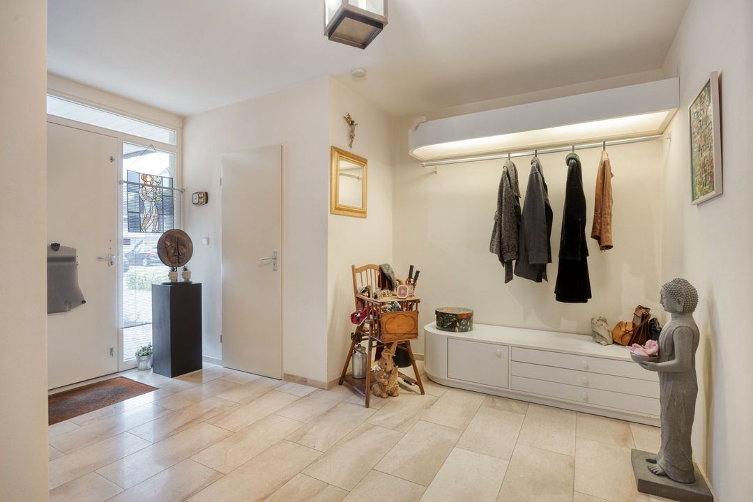 U betreedt de woning via een lichte en royale entree van circa 14 m², afgewerkt met een stijlvolle hardstenen tegelvloer die direct een verzorgde en hoogwaardige indruk achterlaat. Vanuit de hal heeft u toegang tot de meterkast, de toiletruimte, de garderobe en de woonkamer. Tevens bevinden zich hier de trapopgang naar de eerste verdieping en de trap naar het souterrain. De volledig betegelde toiletruimte is voorzien van een modern hangcloset. De gehele begane grond (m.u.v. bijkeuken en garage) is uitgerust met comfortabele vloerverwarming, wat bijdraagt aan een aangenaam woonklimaat.