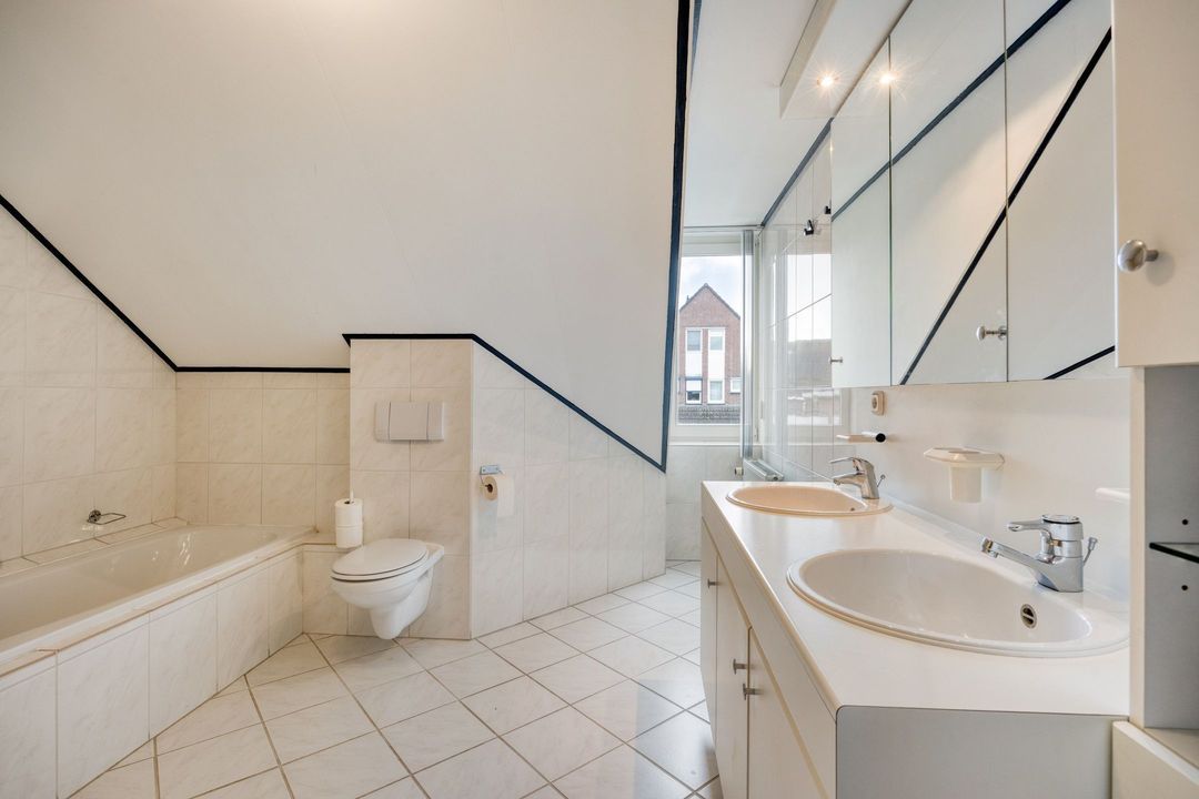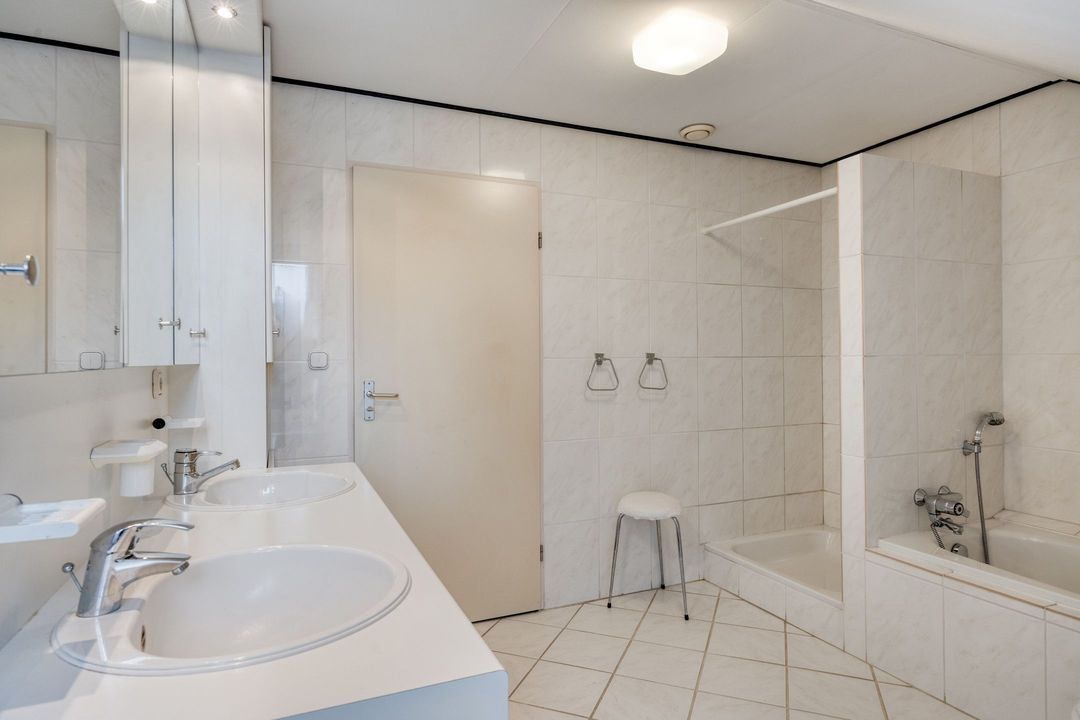 • Badkamer: Deze ruime, goed onderhouden en betegelde badkamer (ca. 10 m²) is uitgerust met een ligbad met douche, een douchecabine, een wastafelmeubel met dubbele wasbak en een hangcloset.