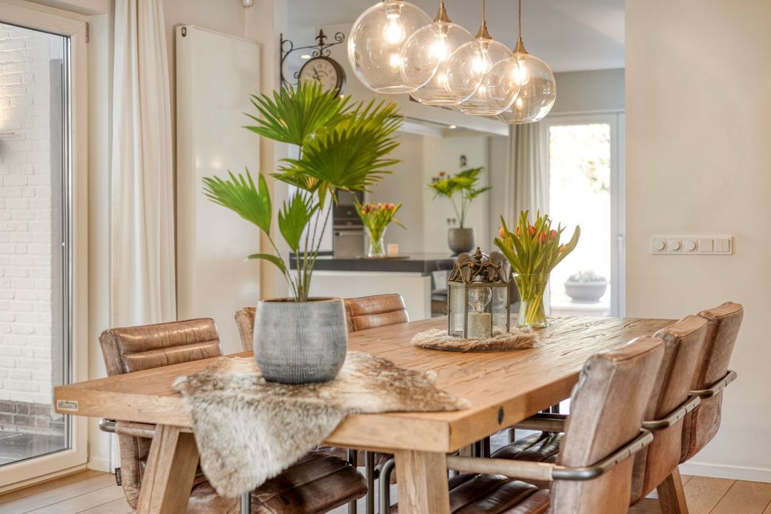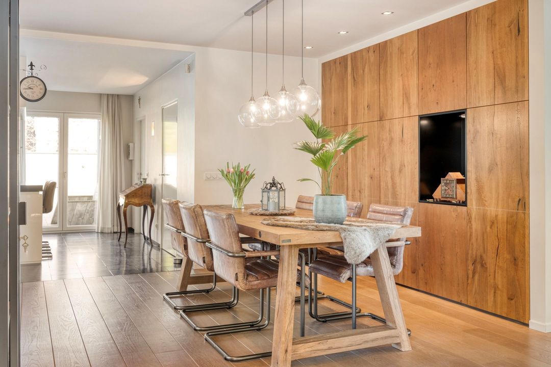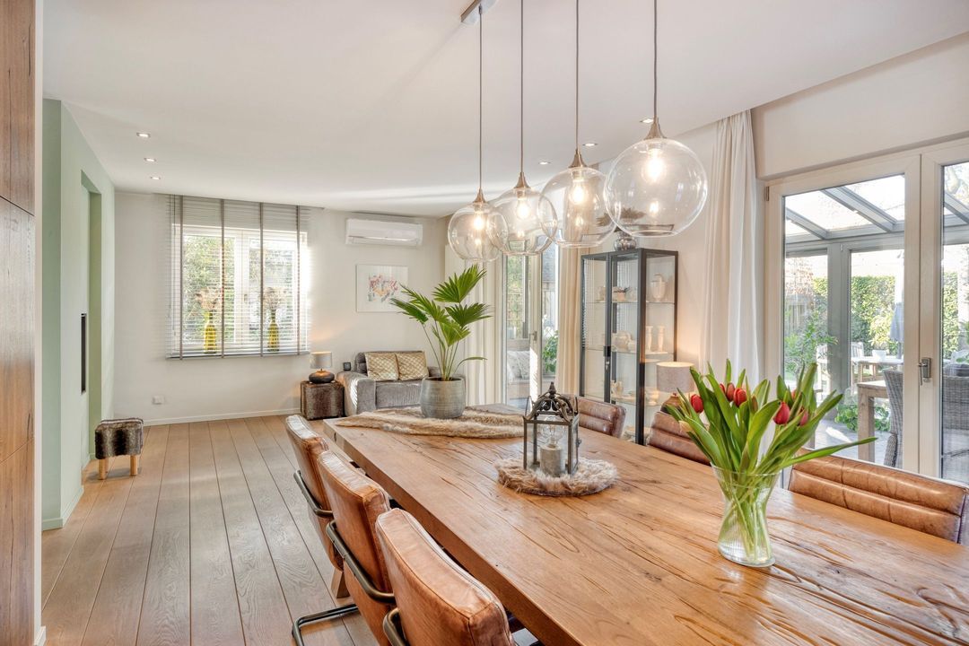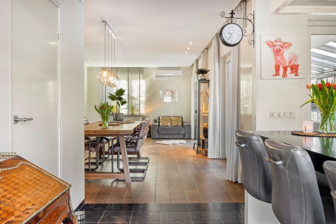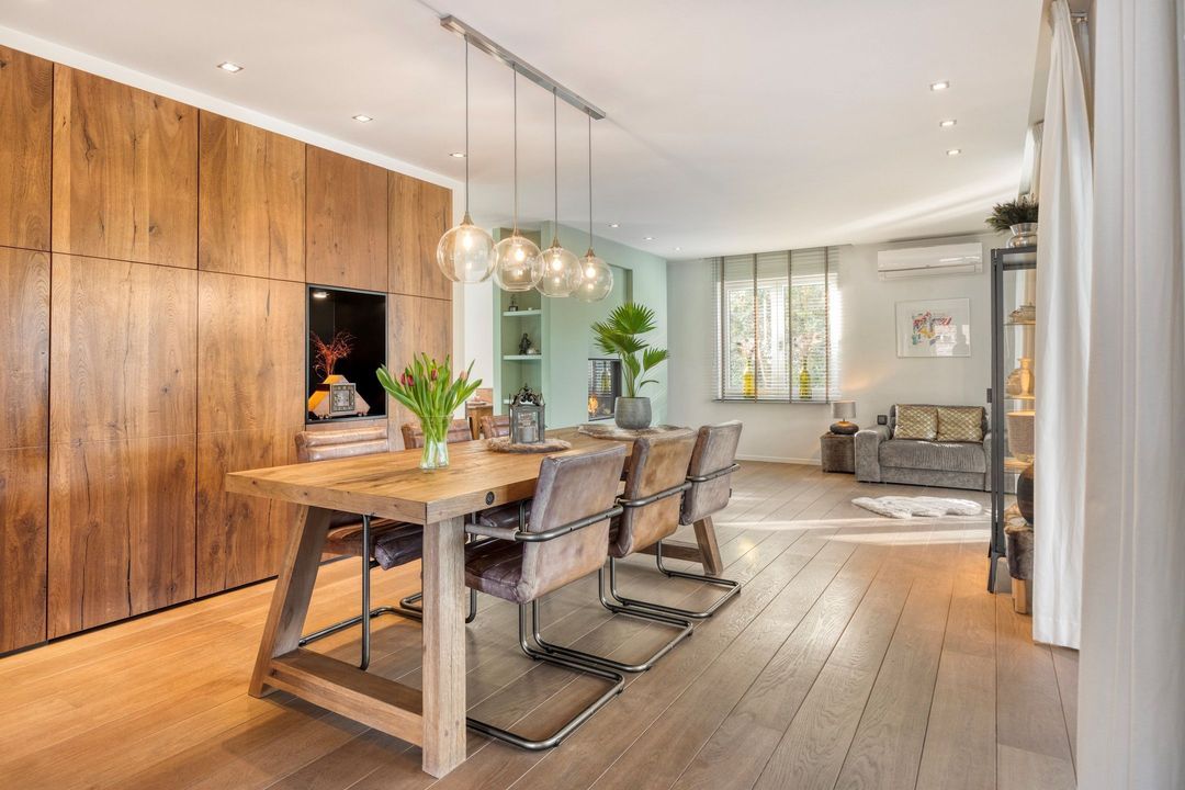 De eetkamer is warm en uitnodigend, voorzien van een fraaie houten vloer, maatwerk inbouwkasten en comfortabele airconditioning. Dankzij de openslaande deuren staat deze ruimte in direct contact met de serre en de tuin.