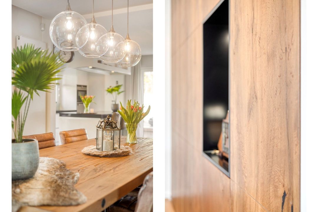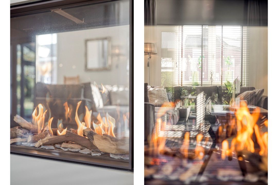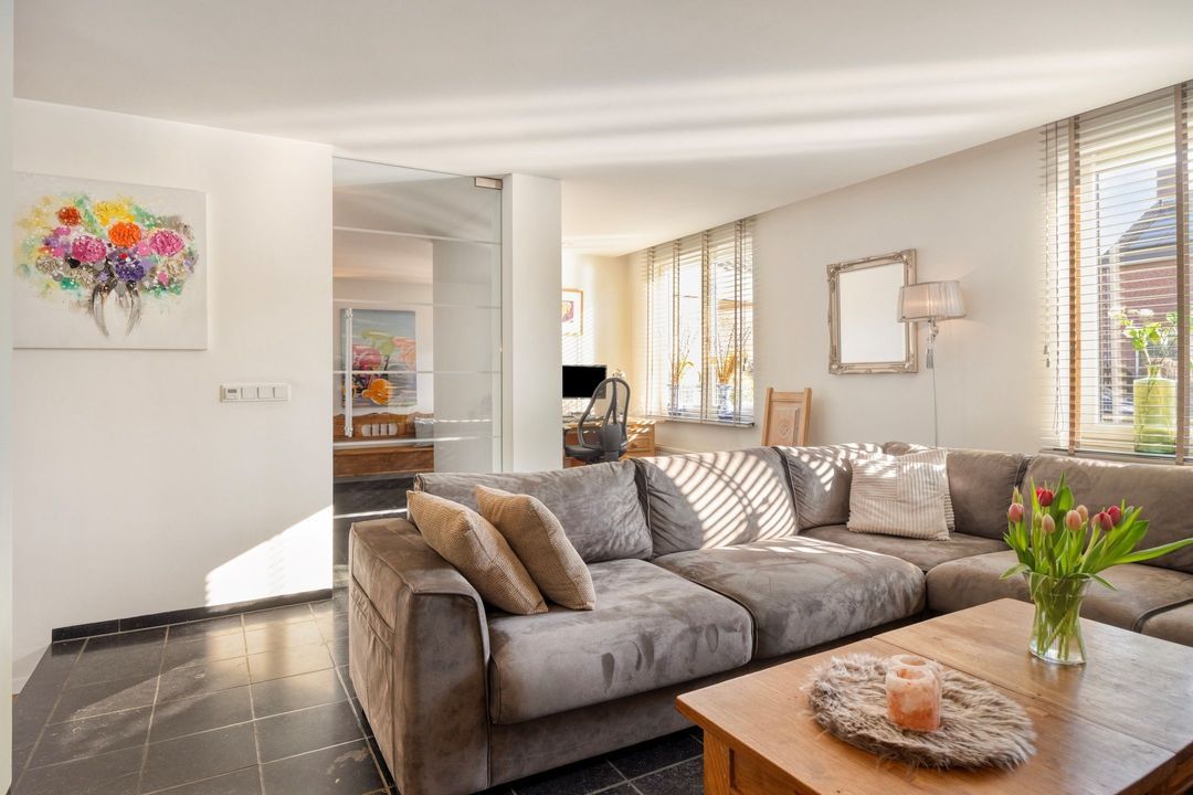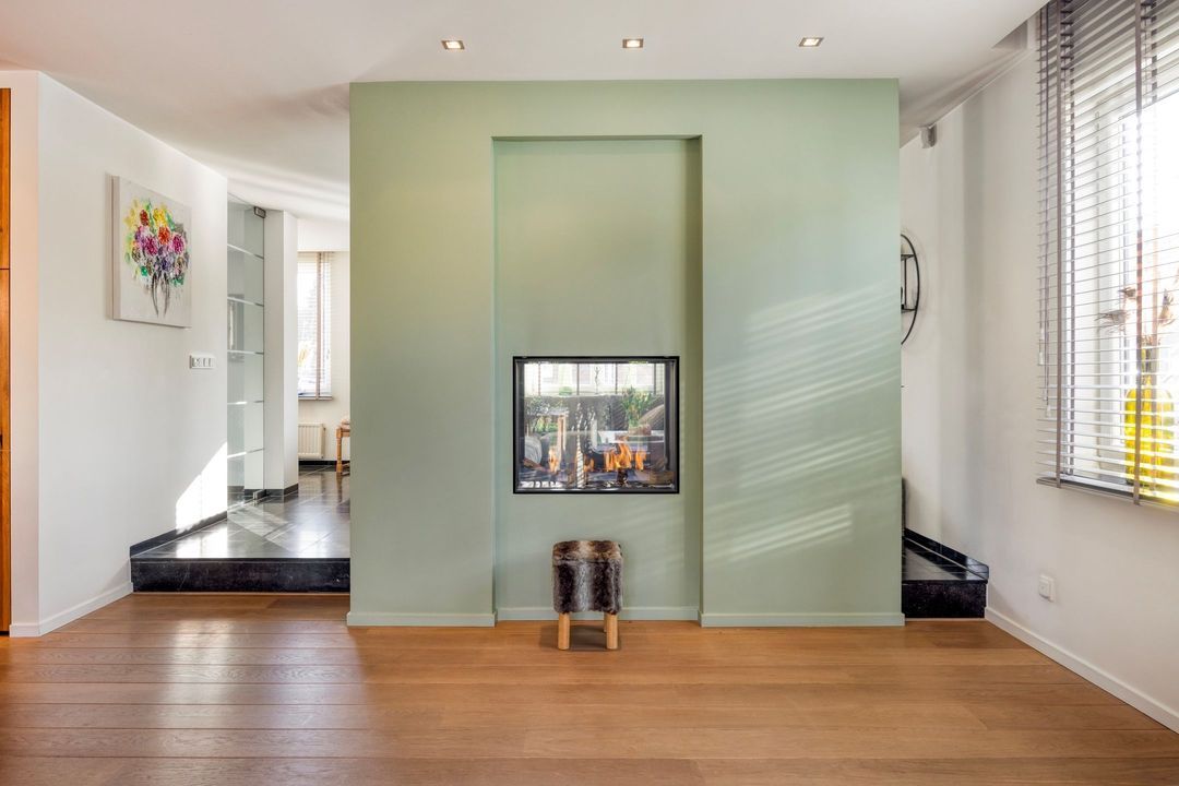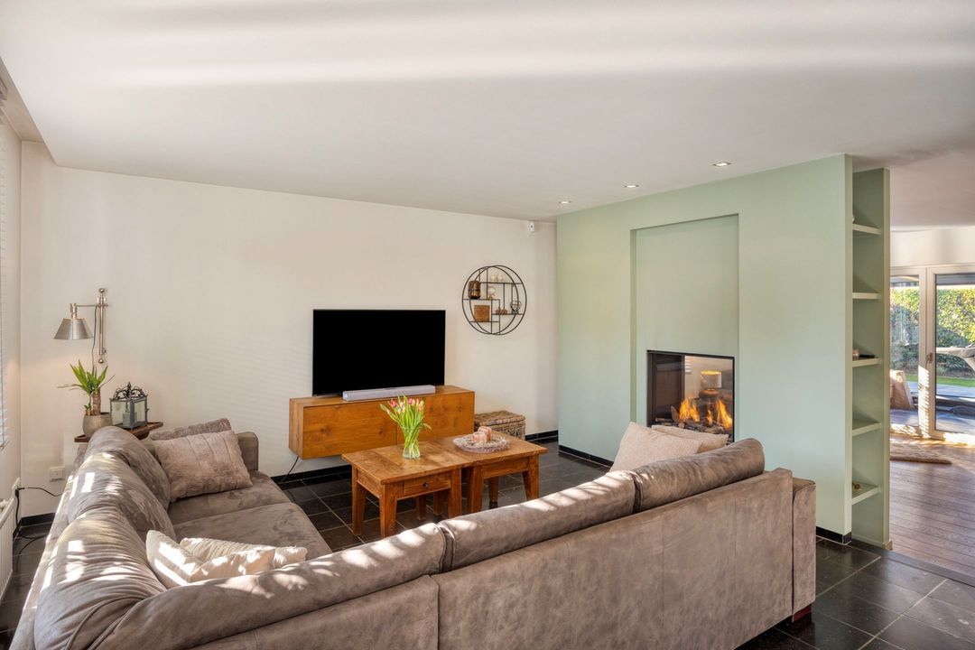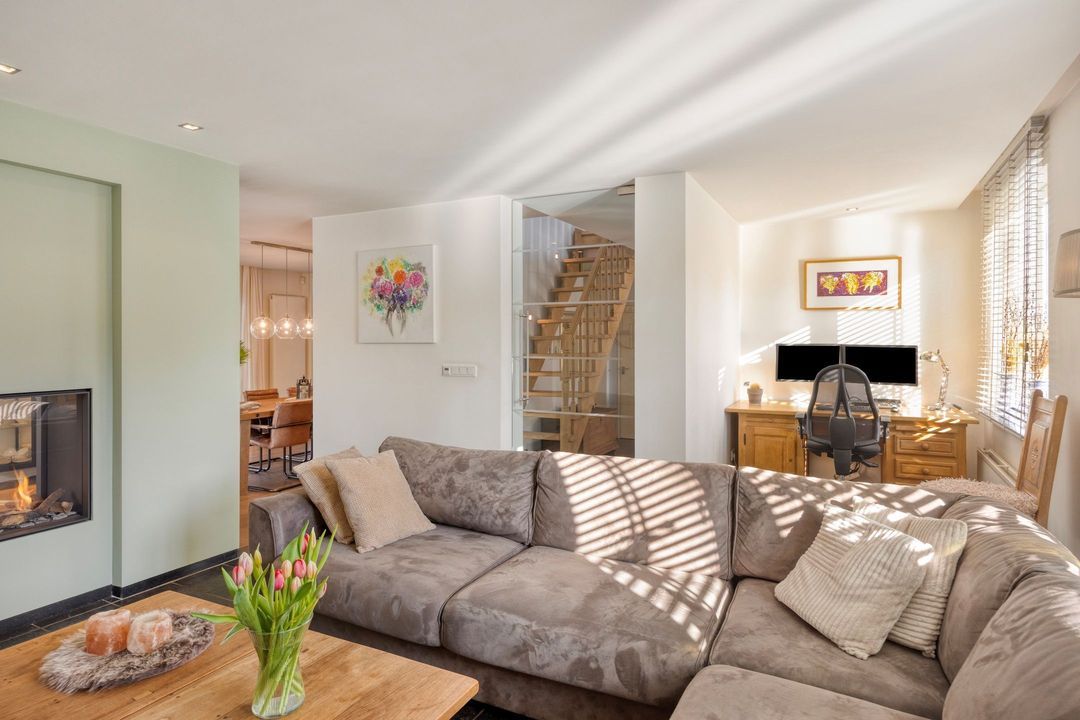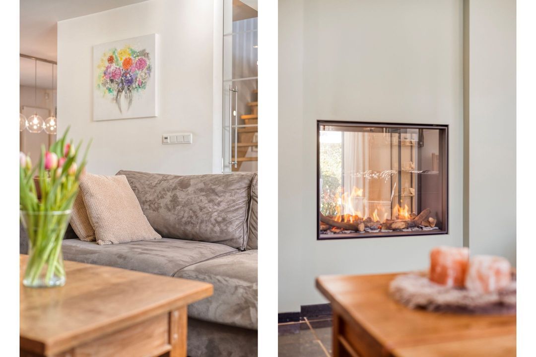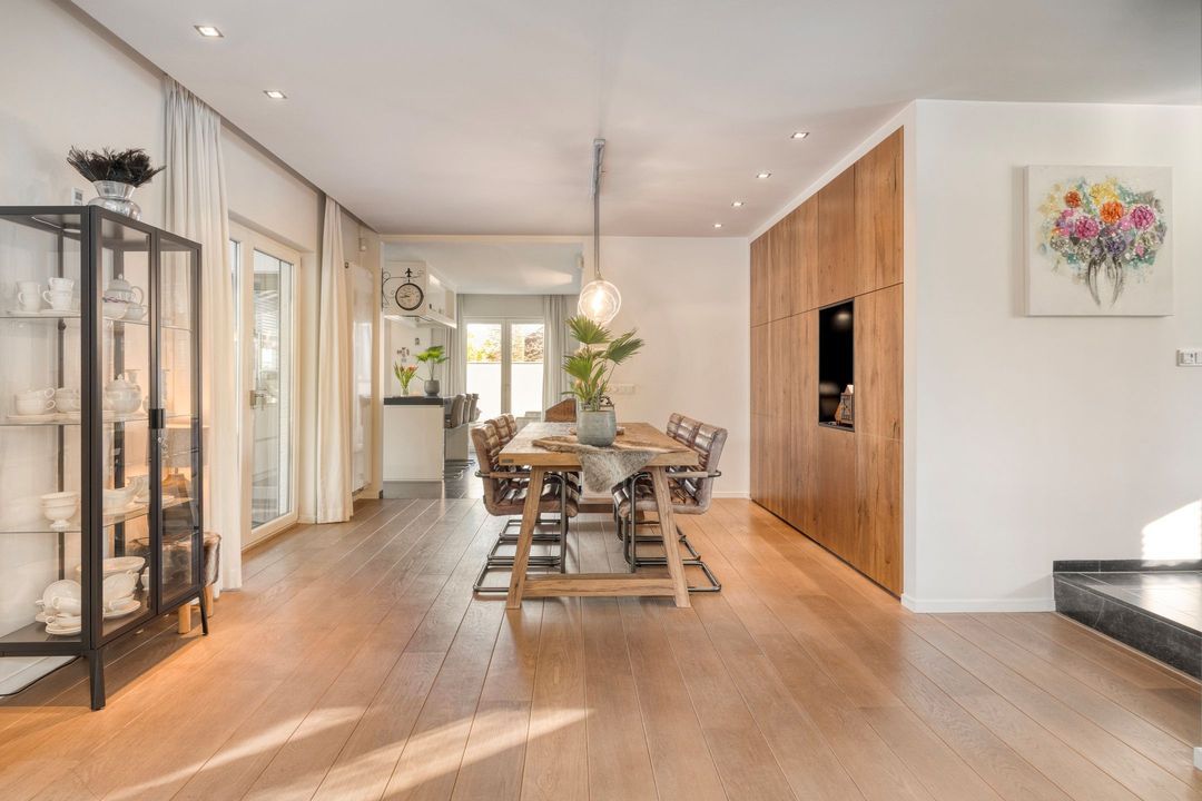 De indrukwekkende leefruimte van ca. 74 m² vormt het hart van de woning en combineert wonen, koken en dineren op harmonieuze wijze. De woonkamer aan de voorzijde kenmerkt zich door de grote raampartijen, die zorgen voor een prachtige lichtinval en een ruimtelijk gevoel. De sfeervolle gashaard vormt een stijlvolle scheiding tussen het zitgedeelte en de eetkamer.