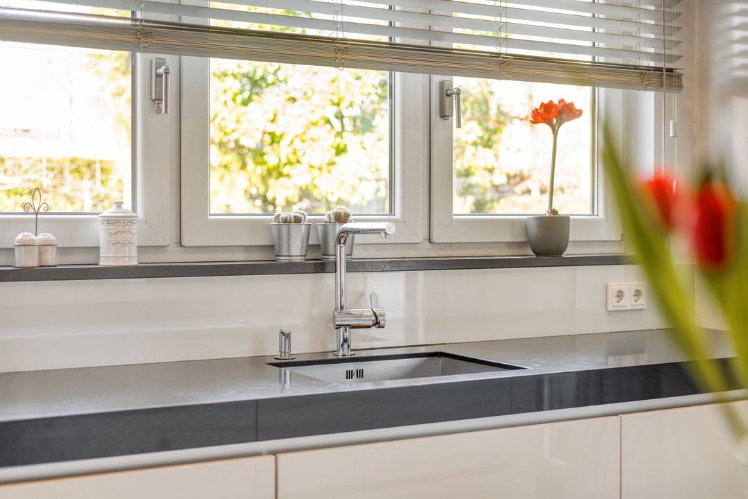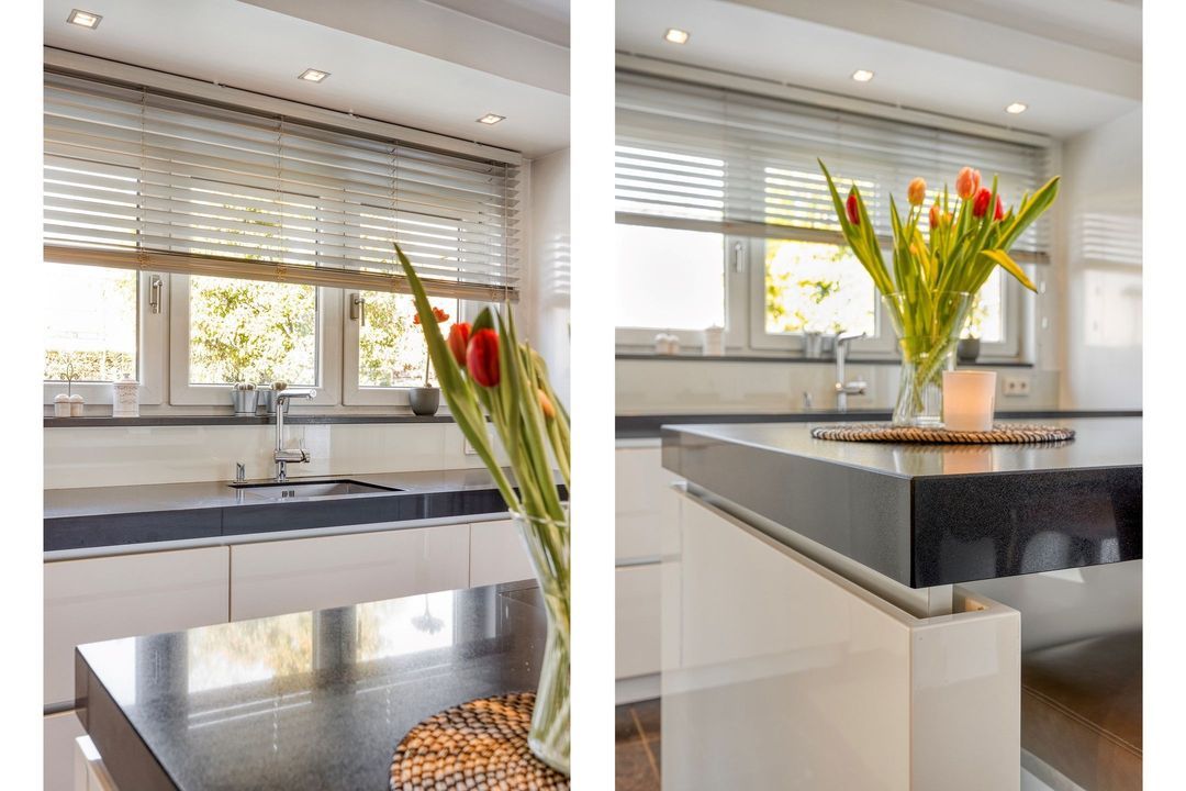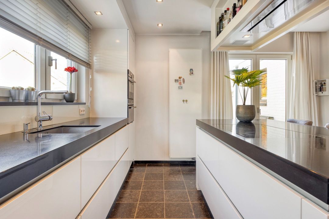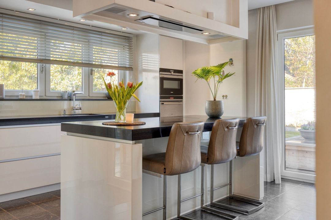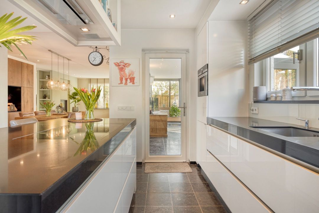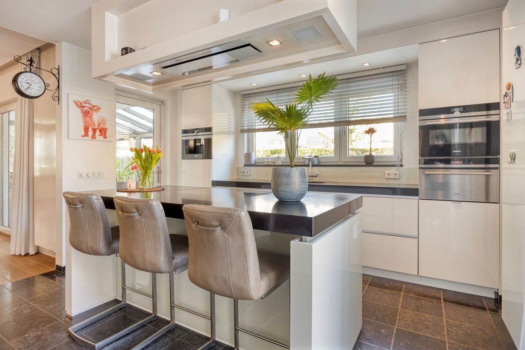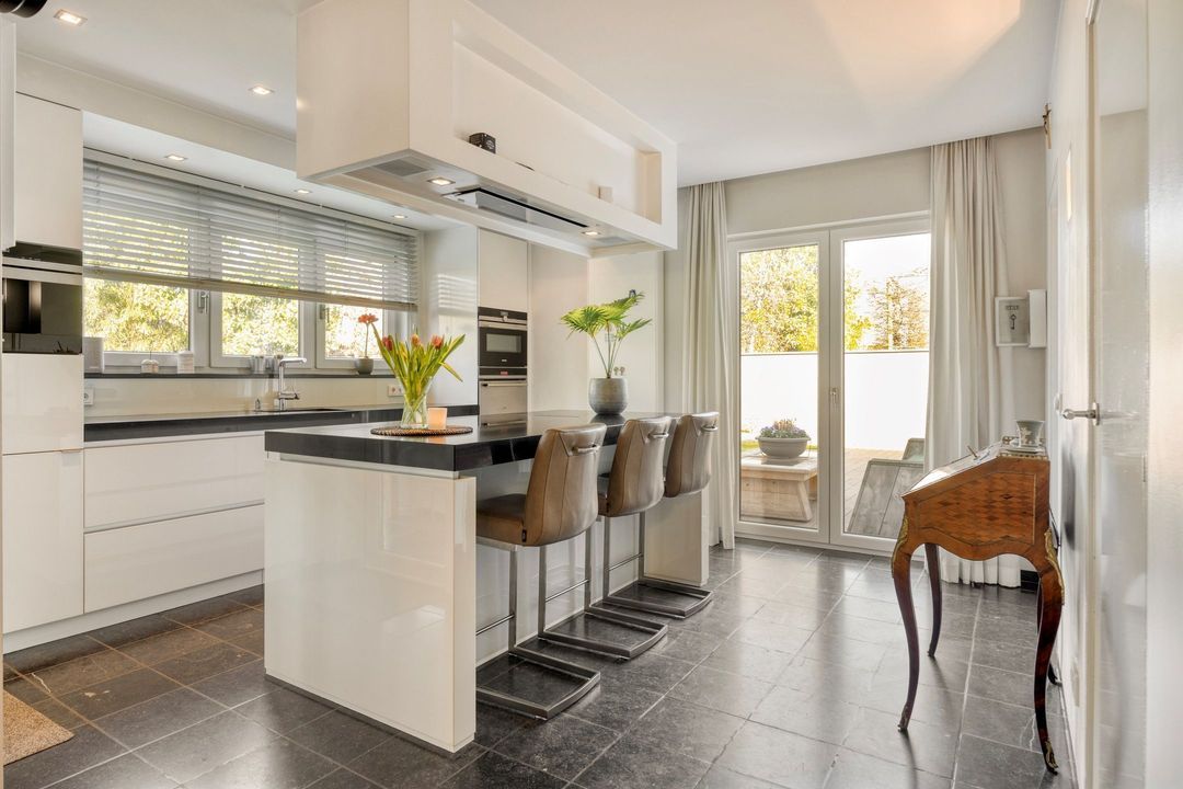 De moderne leefkeuken is uitgevoerd met een kookeiland en strakke, greeploze fronten. De keuken is uitgerust met hoogwaardige inbouwapparatuur van Siemens, waaronder een inductiekookplaat, een afzuiging, een combi-oven, een stoomoven, een koffieapparaat, een koelkast en een vaatwasser. Vanuit de keuken bereikt u zowel de serre als de praktische bijkeuken.
