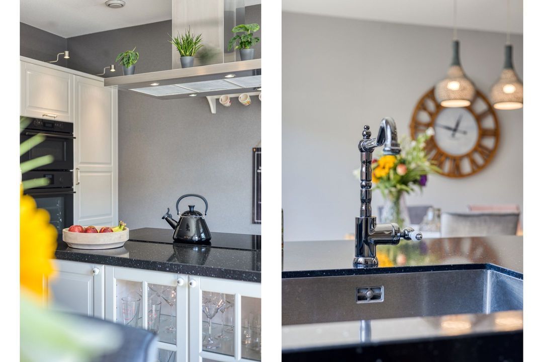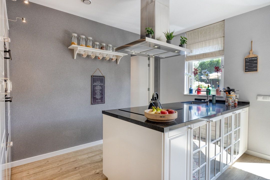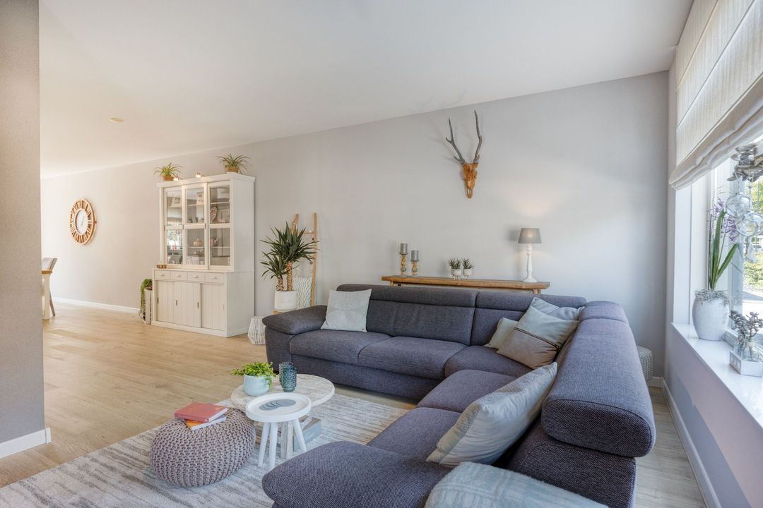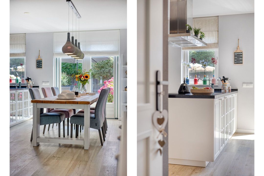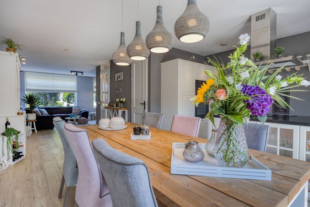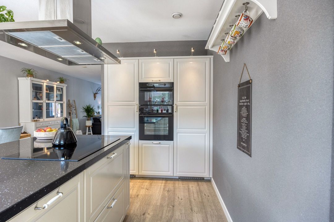 De sfeervolle woonkamer met open keuken (totaal ca. 50 m²) biedt volop ruimte en licht, mede dankzij de grote raampartijen aan de achterzijde. De keuken is landelijk-modern van stijl, geplaatst aan de achterzijde en uitgevoerd met een kookeiland en hoogwaardige inbouwapparatuur: een oven, combi-oven, inductiekookplaat, afzuigkap, vaatwasser en koelkast.