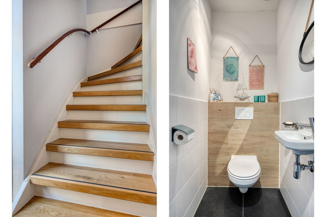 Binnenkomend in ruime entree (ca. 6 m² groot), voorzien van mooie, donkere tegelvloer, treft u de toiletruimte, de meterkast en de toegangsdeur naar de woonkamer met open keuken. Tevens bevindt zich hier de trapopgang met de stijlvolle eikenhouten trap naar de eerste verdieping. De gehele begane grond is voorzien van een comfortabele vloerverwarming. De toiletruimte is gedeeltelijk betegeld, voorzien van een keramisch houtaccent en beschikt over een hangcloset en een fonteintje.