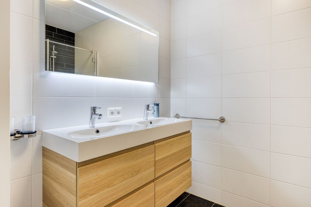 • Badkamer: De moderne, betegelde badkamer is ca. 5 m² groot en voorzien van een inloopdouche, een wastafelmeubel met dubbele wasbak, een verwarmde spiegel en een tweede hangcloset.