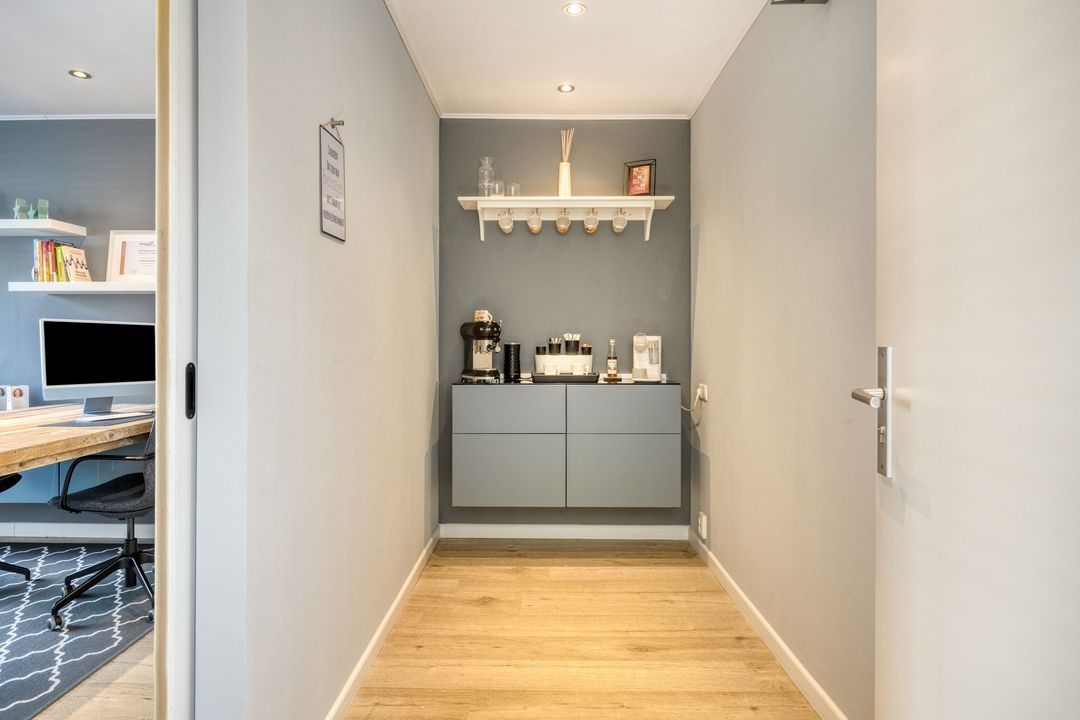 Aansluitend aan de keuken bevindt zich de bijkeuken/pantry (ca. 5 m²), momenteel ingericht als koffiecorner. Vanuit hier heeft u toegang tot een extra ruimte (de voormalige garage) van ca. 13,5 m², die dankzij de eigen entree ideaal is voor gebruik als praktijkruimte, thuiskantoor of voor het uitoefenen van een beroep aan huis. Ook biedt de bijkeuken/pantry toegang tot de tuin. De tussenwand tussen deze twee ruimtes kan desgewenst worden verwijderd, waardoor één grote ruimte ontstaat.