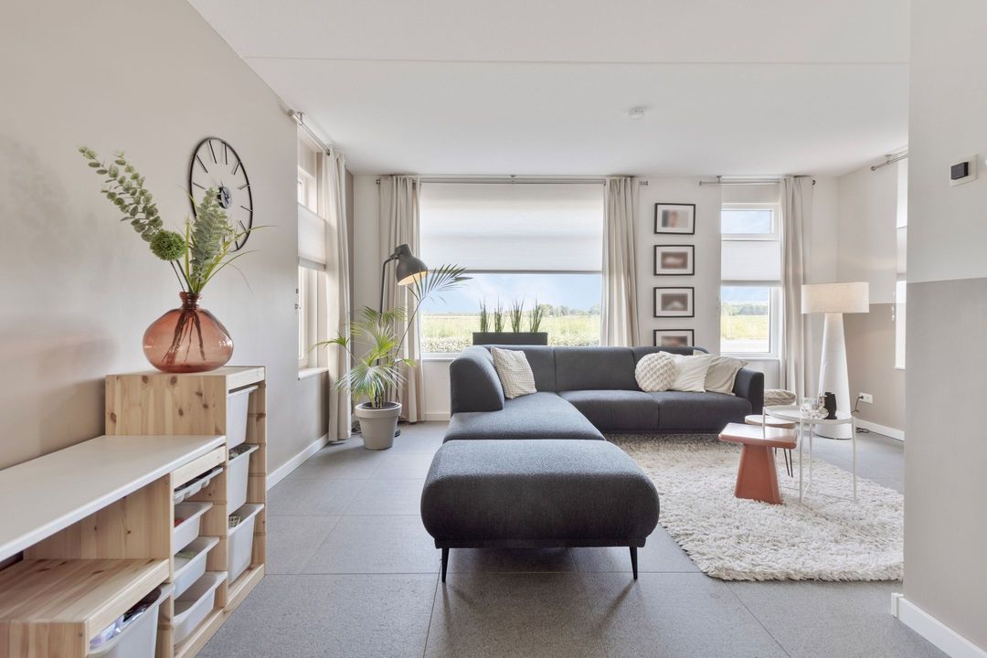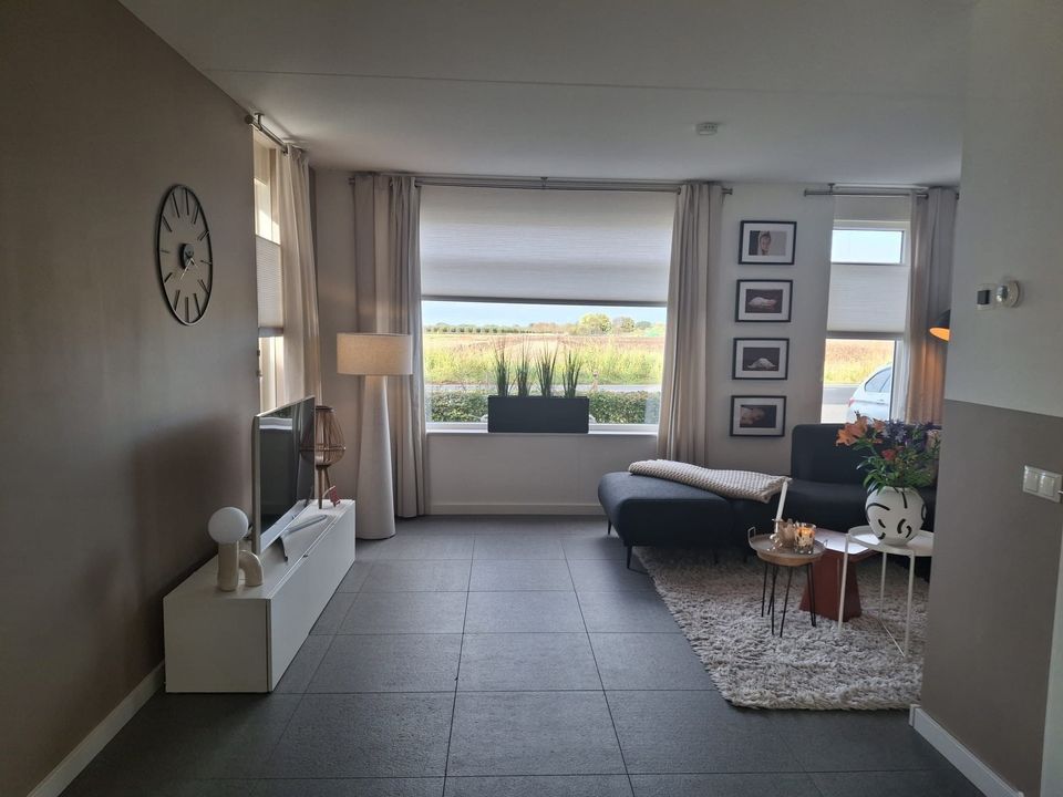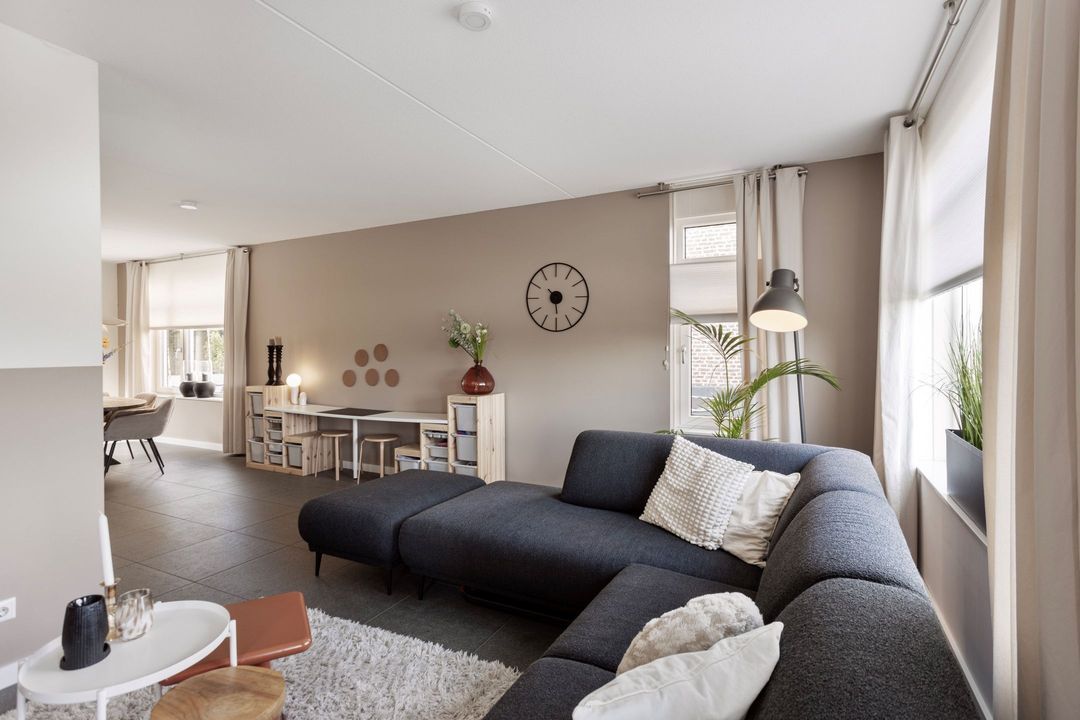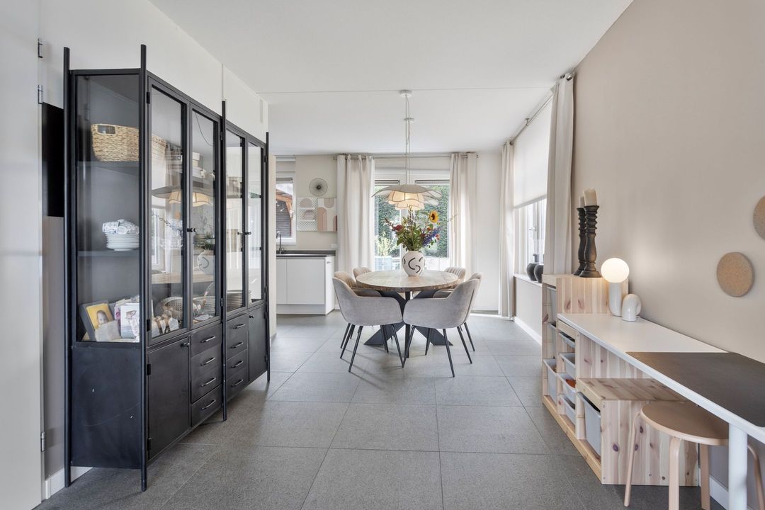 De woonkamer en keuken beslaan samen ca. 42 m² en bieden veel lichtinval dankzij de grote raampartijen en openslaande deuren naar de tuin. De tegelvloer met comfortabele vloerverwarming loopt door over de gehele begane grond en een praktische trapkast zorgt voor extra bergruimte.