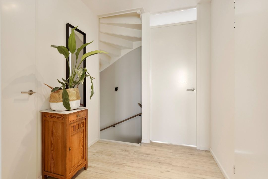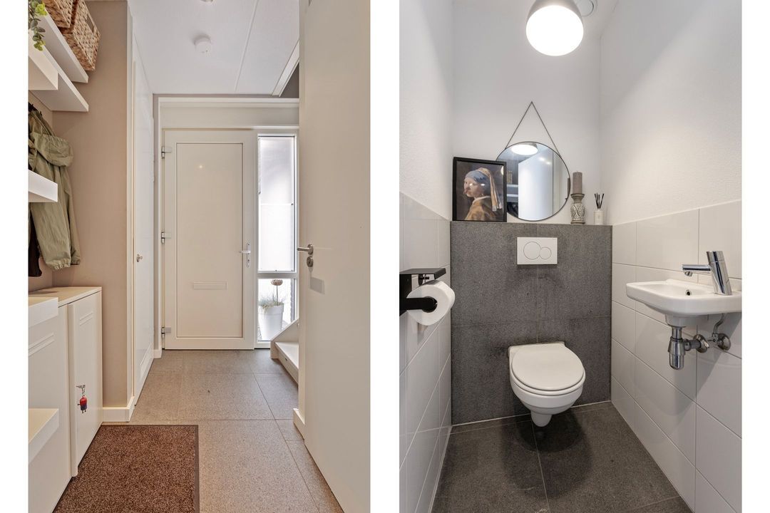 Via de lichte entree, afgewerkt met een fraaie tegelvloer, komt u binnen in de woning. De entree geeft toegang tot de meterkast, de deels betegelde toiletruimte met modern hangcloset en fonteintje, de trapopgang naar de eerste verdieping en de woonkamer met open keuken.