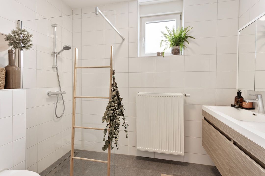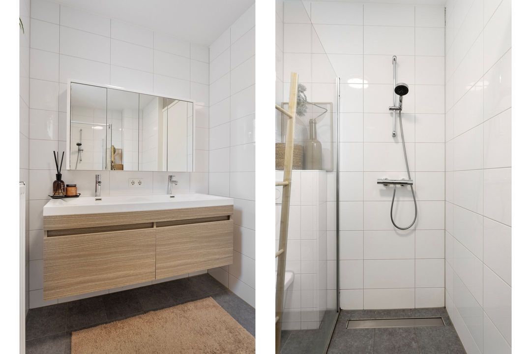 • Badkamer: De moderne badkamer (ca. 5 m²) is betegeld en voorzien van een inloopdouche, een wastafelmeubel met dubbele wasbak en een hangcloset.
