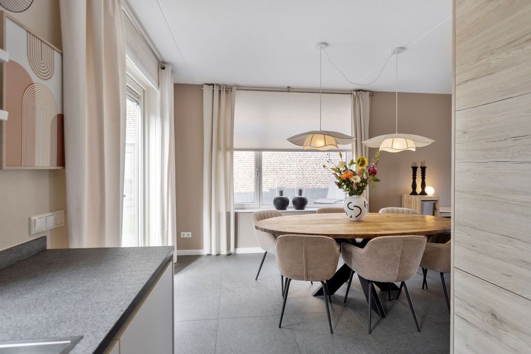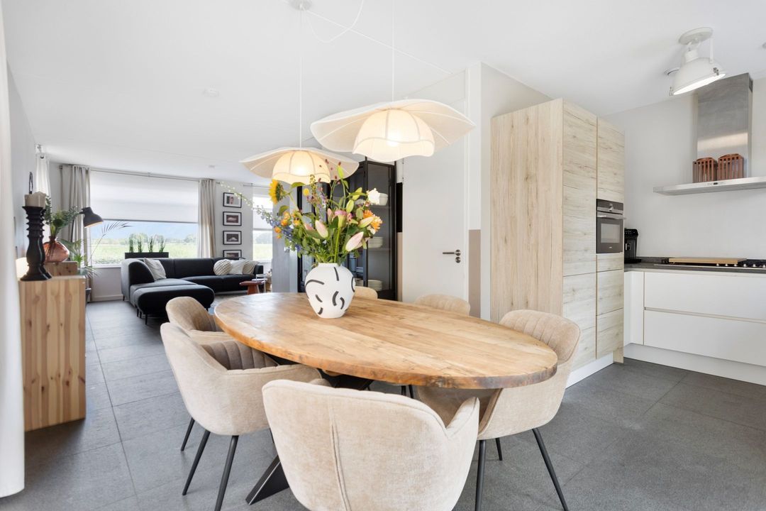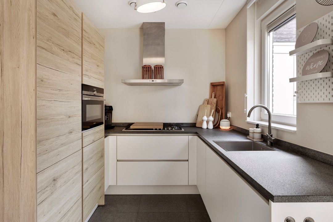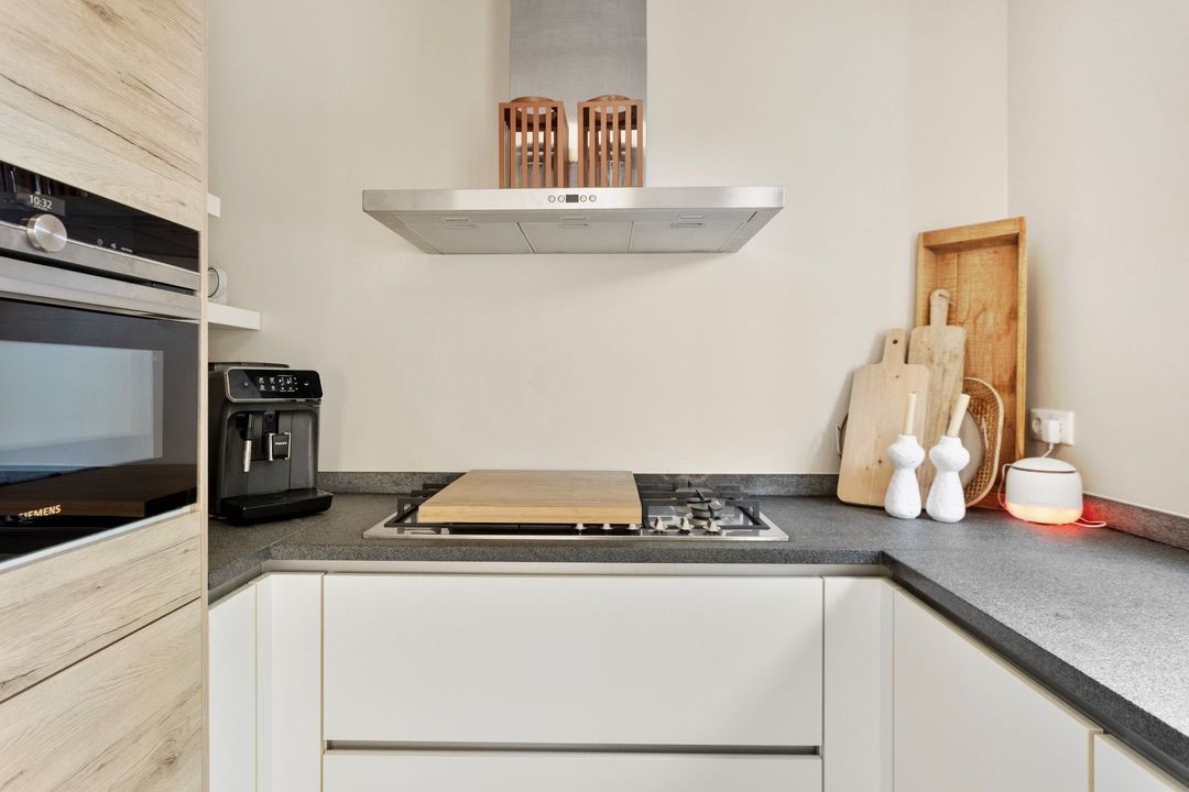 De keuken bevindt zich aan de achterzijde van de woning en is uitgevoerd met greep loze fronten en moderne inbouwapparatuur van Siemens, waaronder een oven, combi-oven, 6-pits gasfornuis, afzuigkap, vaatwasser en koelkast. Dankzij de openslaande deuren staat de keuken in directe verbinding met de achtertuin, waardoor binnen en buiten mooi samenvloeien.