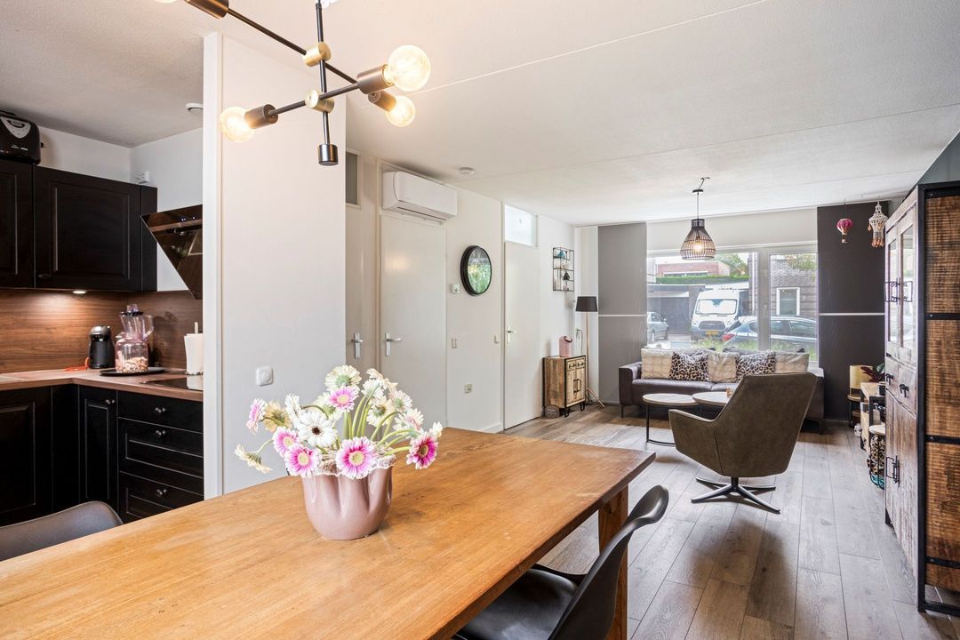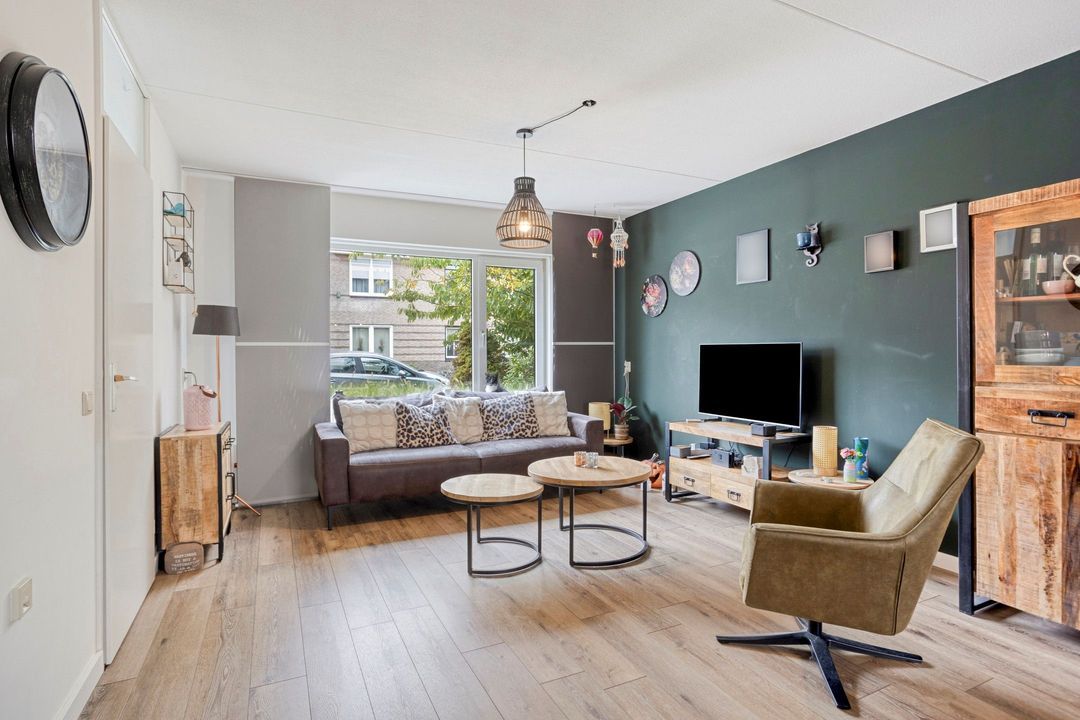 De ruime woonkamer met open keuken (samen ca. 34 m²) vormt het hart van de woning. Dankzij de grote raampartijen aan zowel de voor- als achterzijde geniet de leefruimte de hele dag door van een aangename natuurlijke lichtinval. De lichte PVC-vloer uit de hal loopt naadloos door in deze ruimte, wat zorgt voor een rustige, harmonieuze uitstraling.