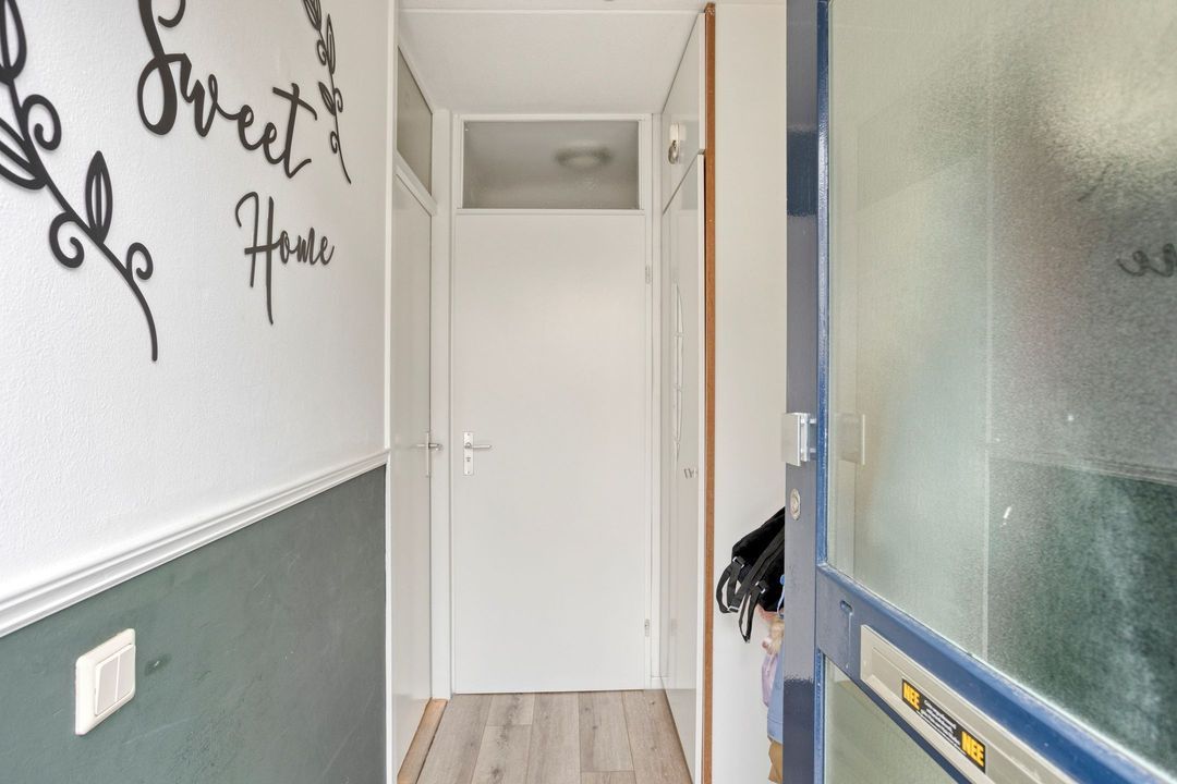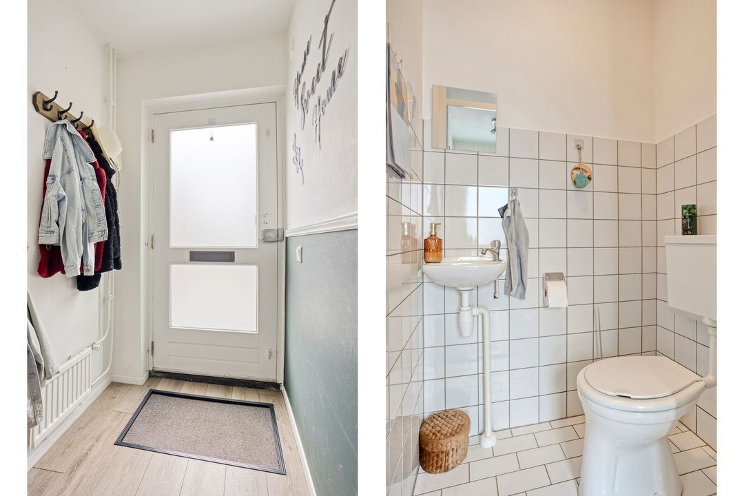Bij binnenkomst in de hal (ca. 3 m²) wordt u verwelkomd in een verzorgde en lichte ruimte met de meterkast, de toegang tot het toilet en de deur naar de woonkamer met open keuken. De betegelde toiletruimte is voorzien van een staand closet en fonteintje.