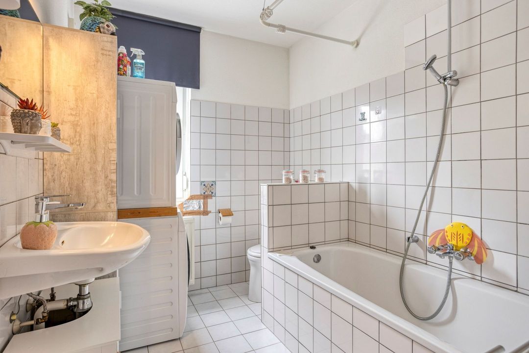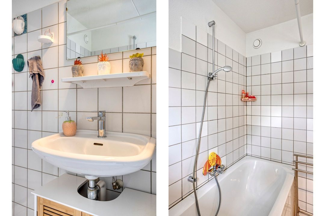 • Badkamer: De betegelde badkamer is ca. 5 m² groot en voorzien van een ligbad met douche, een wastafel en toilet.