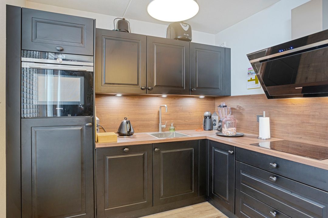 De moderne, matzwarte keuken in L-opstelling is gesitueerd aan de achterzijde van de woning en vormt een mooi geheel met de leefruimte. De keuken is uitgerust met hoogwaardige Siemens-inbouwapparatuur, waaronder een combi-oven, inductiekookplaat, afzuigkap, vaatwasser en koelkast. Via de achterdeur is er rechtstreeks toegang tot de tuin – ideaal tijdens het koken of wanneer u gasten ontvangt.