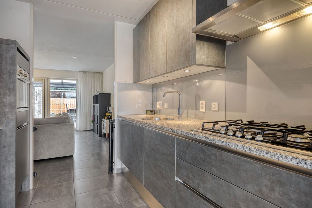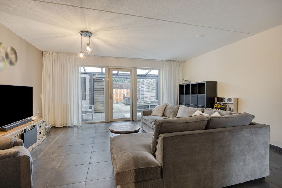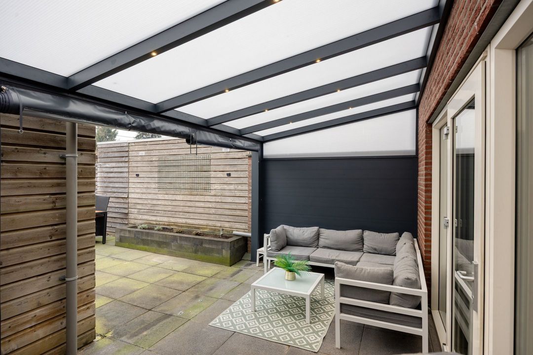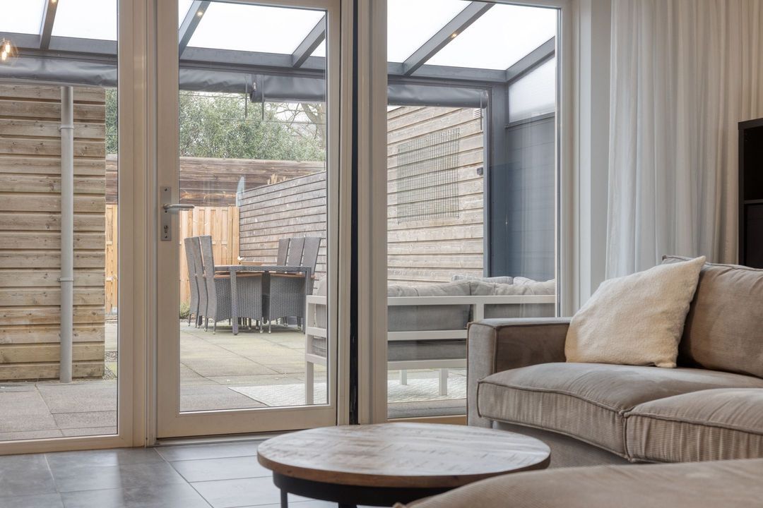 Vanuit de woonkamer heeft u direct toegang tot de achtertuin met overkapping, waardoor binnen- en buitenleven op een prettige manier met elkaar worden verbonden.