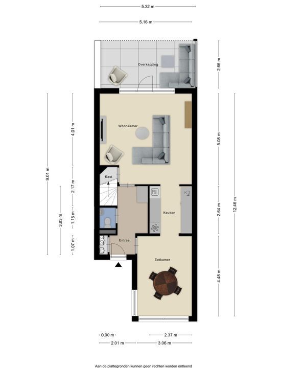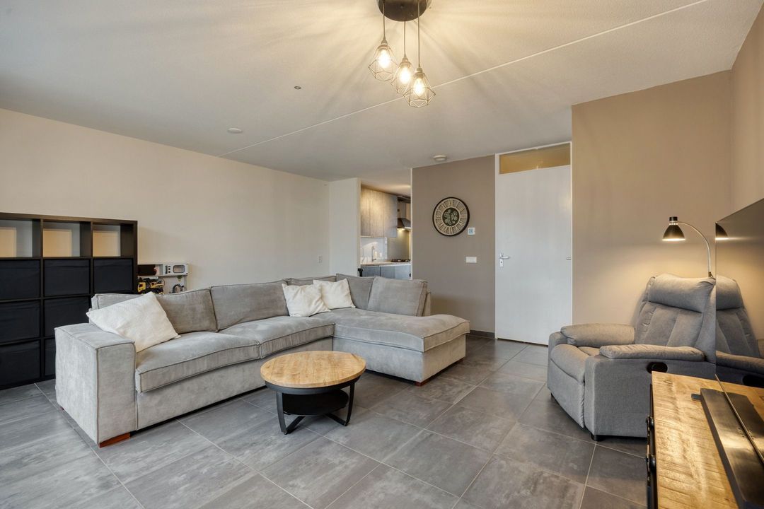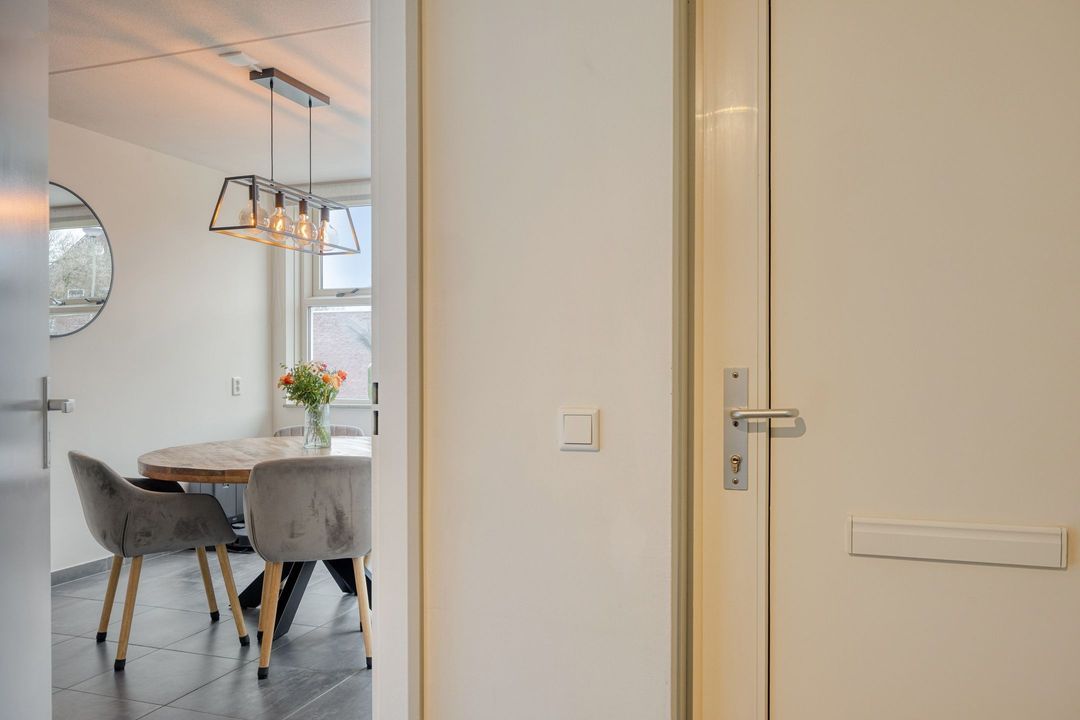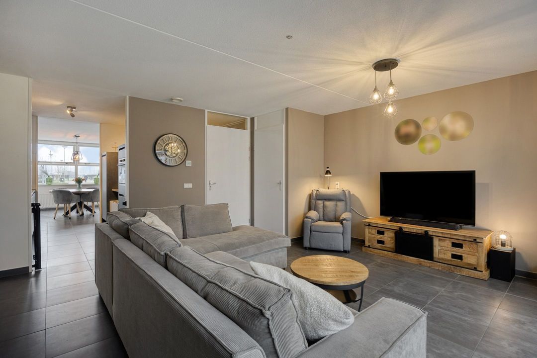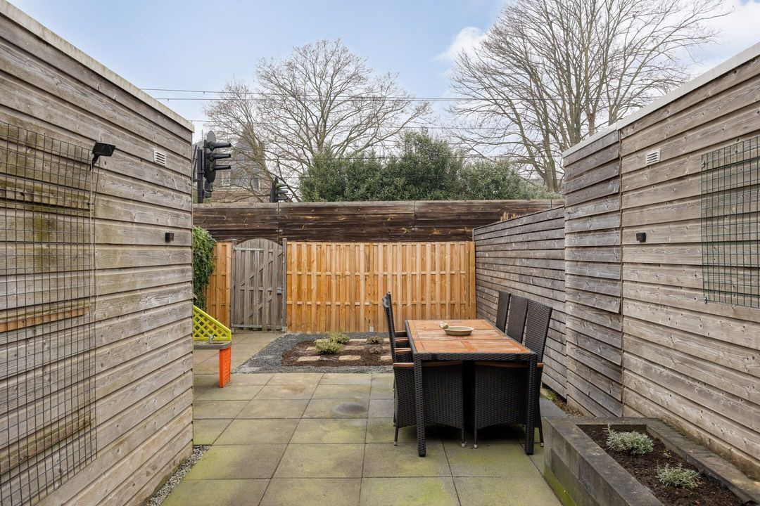 Vanuit de woonkamer heeft u direct toegang tot de achtertuin met overkapping, waardoor binnen- en buitenleven op een prettige manier met elkaar worden verbonden.