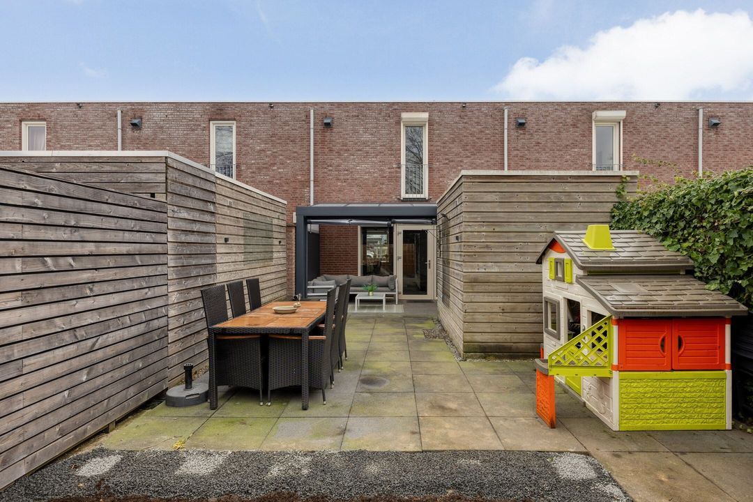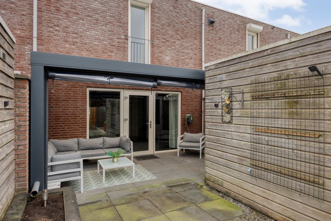 De woning beschikt over een volledig omsloten, ruime en onderhoudsvriendelijke achtertuin met achteringang, die volop privacy biedt. Het is heerlijk vertoeven onder de overkapping grenzend aan de woonkamer. De overkapping is volledig af te sluiten door middel van een zeil, waardoor het ook op de koudere dagen een fijne plek is om te zitten. De tuin biedt veel mogelijkheden om geheel naar eigen wens te worden ingericht, bijvoorbeeld met een terras, speelgedeelte of groenborder. Daarnaast is er een praktische berging van circa 10 m² aanwezig, ideaal voor het stallen van fietsen, tuingereedschap en overige opslag. Dankzij de achteringang is de tuin bovendien eenvoudig toegankelijk en extra functioneel.