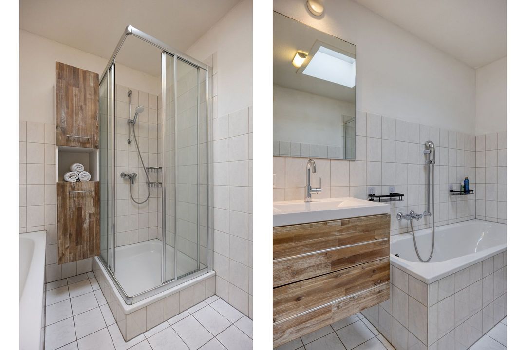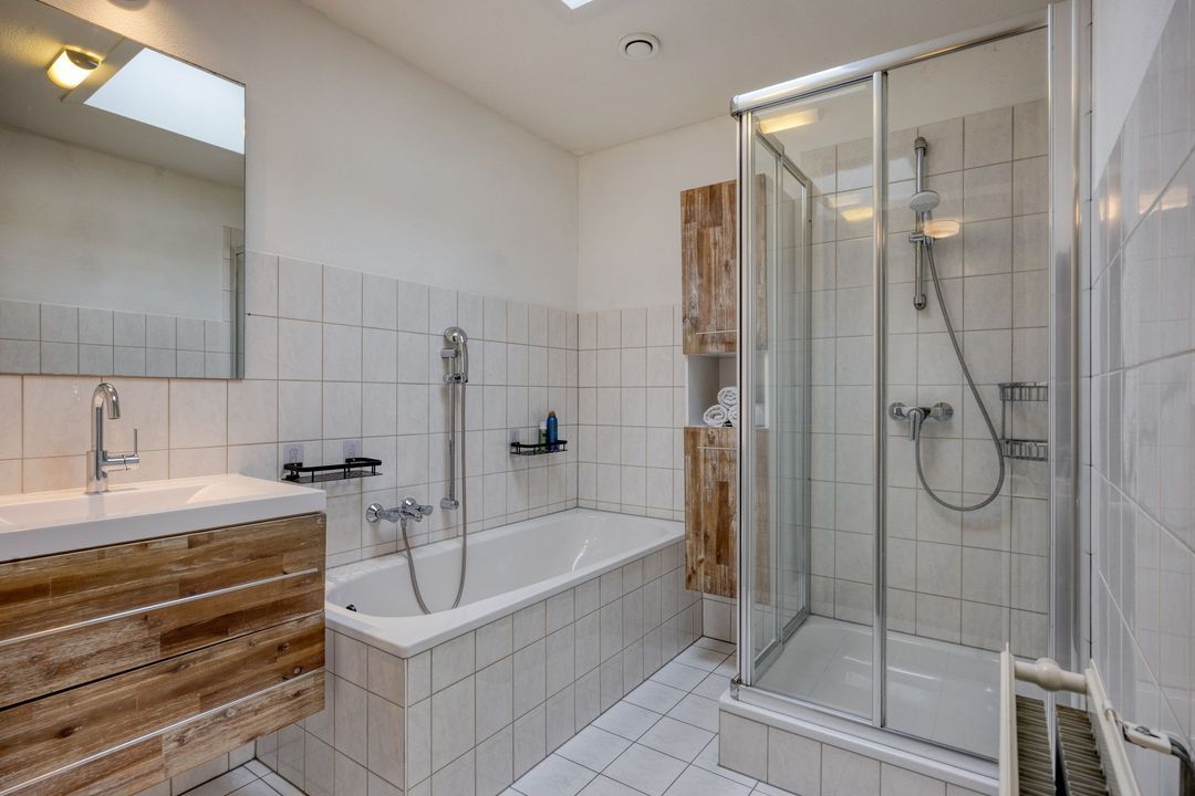 • Badkamer: Net verzorgde, betegelde badkamer van circa 5,5 m² met ligbad, douche en wastafelmeubel.