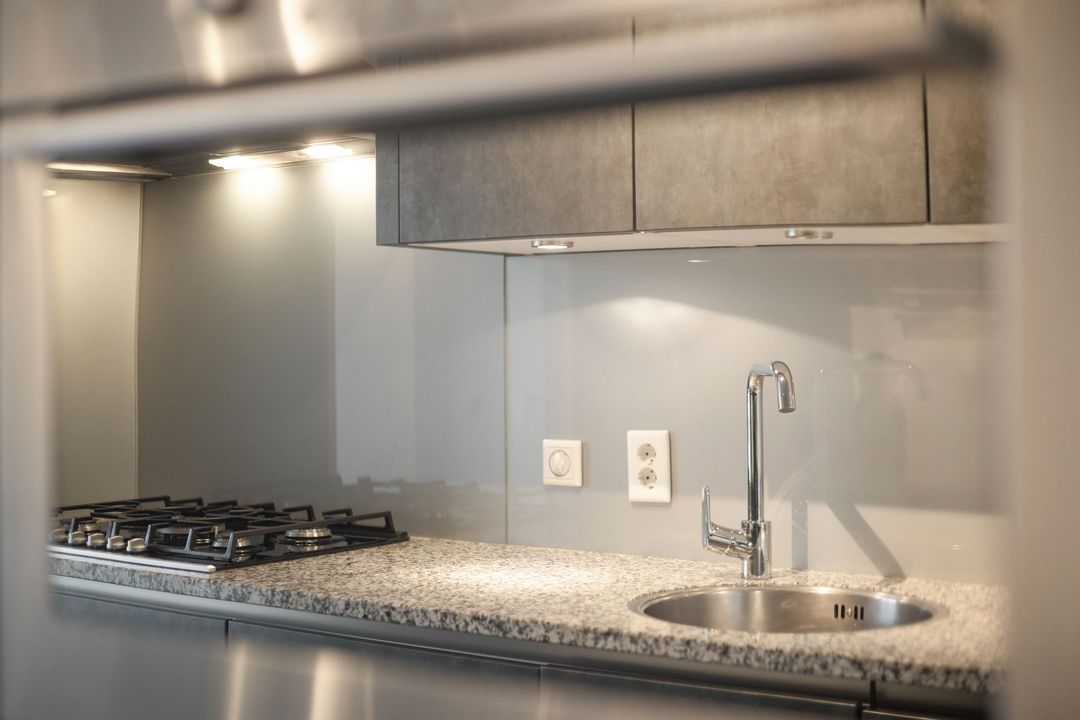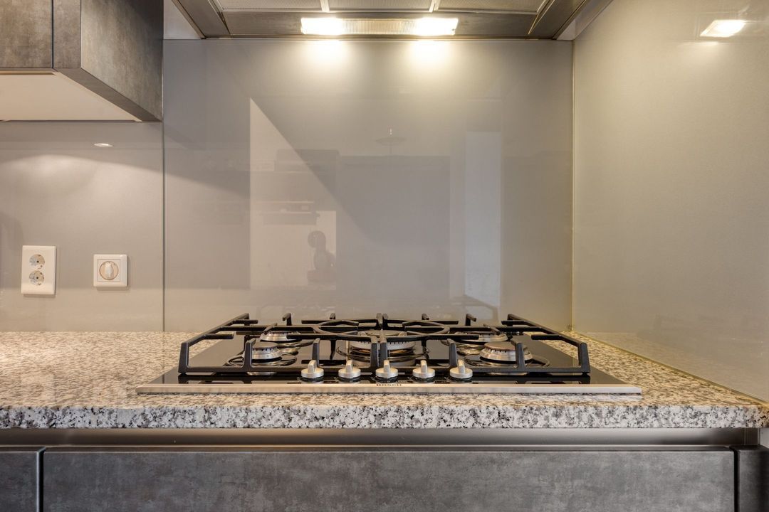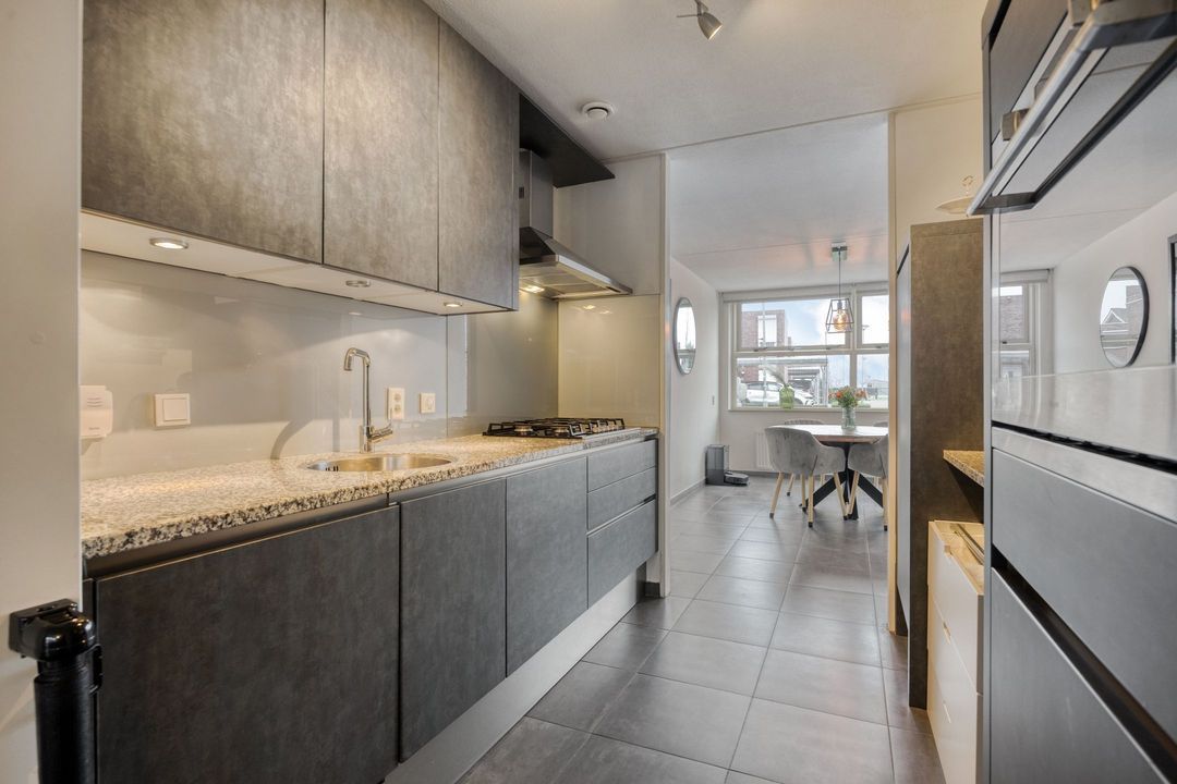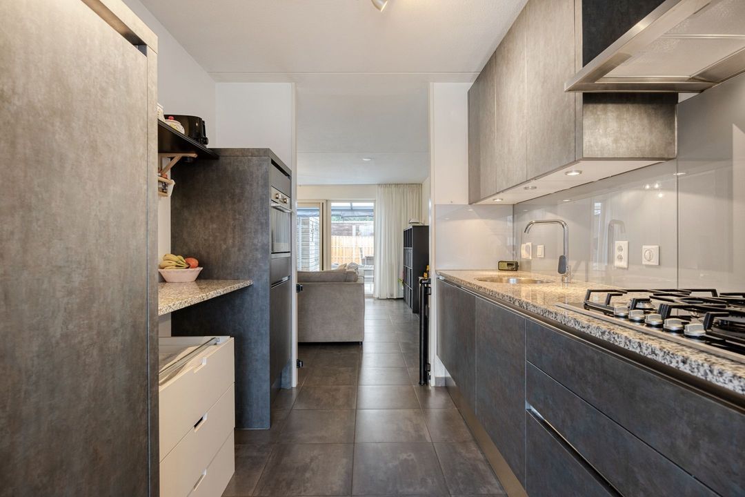 De open keuken, centraal gesitueerd tussen de eetkamer en woonkamer, is uitgevoerd met antracietkleurige, greeploze fronten en een granieten werkblad. De keuken is compleet uitgerust met diverse inbouwapparatuur, waaronder een 5-pits gasfornuis, afzuigkap, combi-oven, koelkast en vaatwasser.