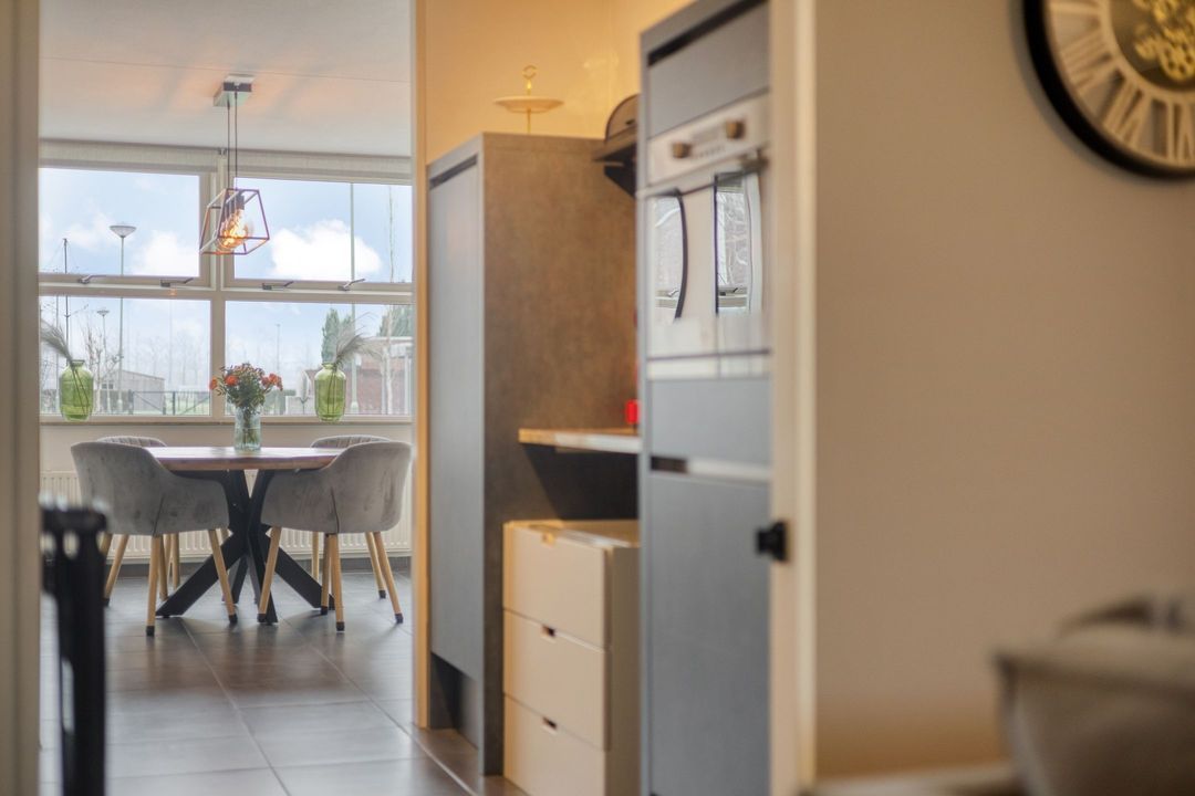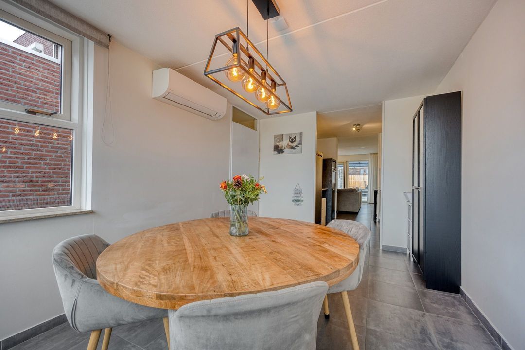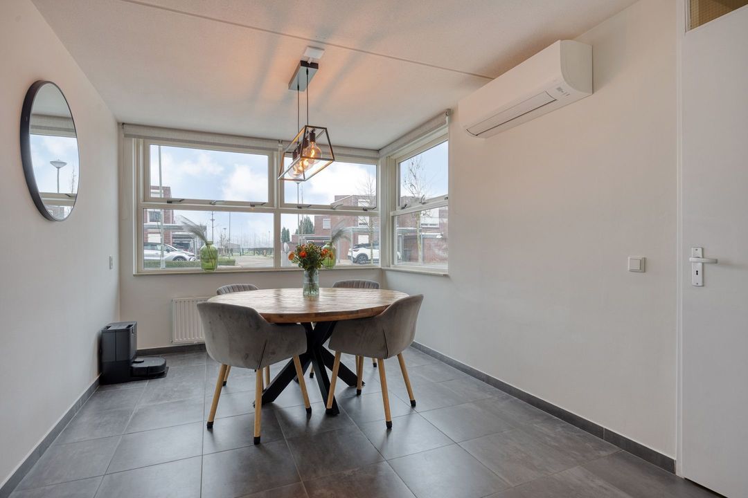 De eetkamer is aan de voorzijde van de woning gelegen en zowel vanuit de entree als via de woonkamer en keuken bereikbaar. Deze ruimte is voorzien van airconditioning. De moderne tegelvloer loopt naadloos door naar de ruime woonkamer en de open keuken. Samen vormen deze leefruimten een royaal geheel van circa 45 m², met veel natuurlijke lichtinval dankzij de grote raampartijen aan zowel de voor- als achterzijde.